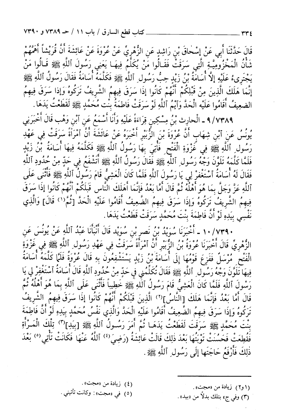 7389 - الحارث بن مسكين قراءة عليه وأنا أسمع عن بن وهب قال أخبرني يونس عن بن شهاب أن عروة بن الزبير أخبره عن عائشة : أن امرأة سرقت في عهد رسول الله صلى الله عليه و سلم في غزوة الفتح فأتي بها رسول الله صلى الله عليه و سلم فكلمه فيها أسامة بن زيد فلما كلمه تلون وجه رسول الله صلى الله عليه و سلم فقال رسول الله صلى الله عليه و سلم أتشفع في حد من حدود الله فقال له أسامة استغفر لي يا رسول الله فلما كان العشي قام رسول الله صلى الله عليه و سلم فأثنى على الله عز و جل بما هو أهله ثم قال أما بعد فإنما أهلك الناس قبلكم أنهم كانوا إذا سرق فيهم الشريف تركوه وإذا سرق فيهم الضعيف أقاموا عليه الحد ثم قال والذي نفسي بيده لو أن فاطمة بنت محمد سرقت قطعت يدها
