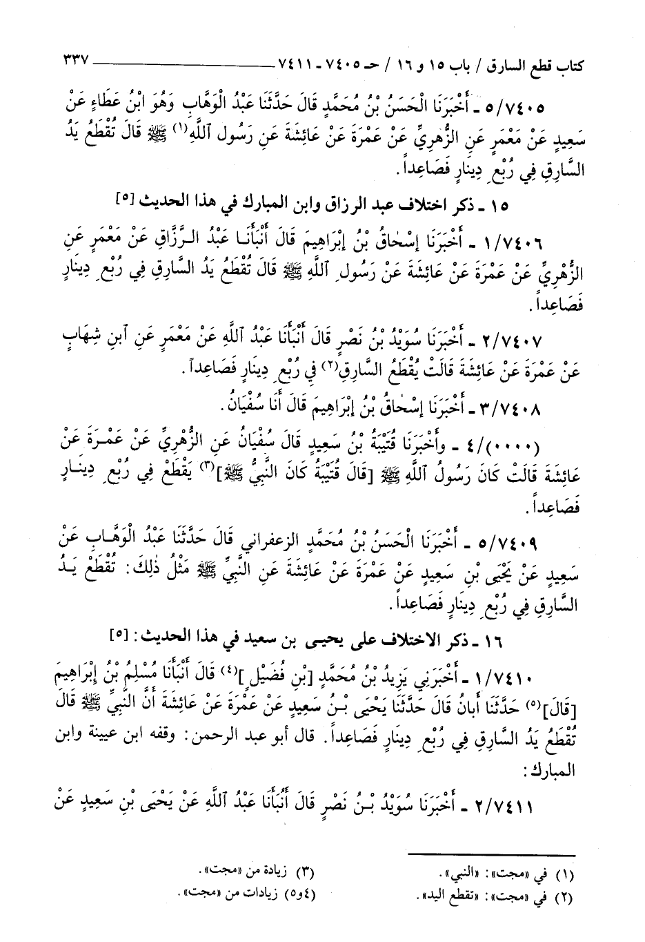 7411 - أخبرنا سويد بن نصر قال أنبأنا عبد الله عن يحيى بن سعيد عن عمرة : أنها سمعت عائشة تقول تقطع في ربع دينار فصاعدا قال أبو عبد الرحمن هذا الصواب من حديث يحيى