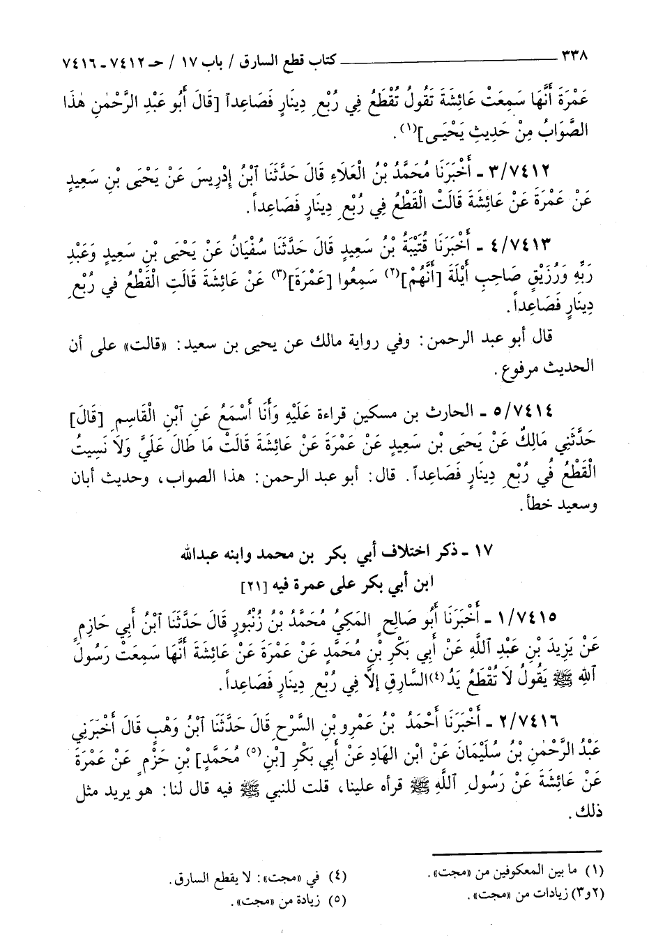 7413 - أخبرنا قتيبة بن سعيد قال حدثنا سفيان عن يحيى بن سعيد وعبد ربه ورزيق صاحب أيلة أنهم سمعوا عمرة عن عائشة قالت : القطع في ربع دينار فصاعدا قال أبو عبد الرحمن وفي رواية مالك عن يحيى بن سعيد قالت على أن الحديث مرفوع