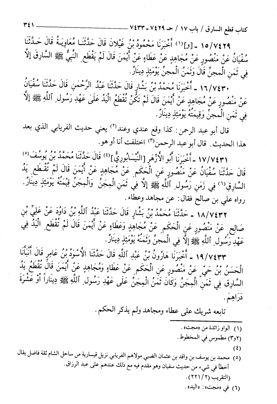 7430 - أخبرنا محمد بن بشار قال حدثنا عبد الرحمن قال حدثنا سفيان عن منصور عن مجاهد عن أيمن قال لم : تكن تقطع اليد على عهد رسول الله صلى الله عليه و سلم إلا في ثمن المجن وقيمته يومئذ دينار قال أبو عبد الرحمن كذا وقع عندي وعند يعني حديث الفريابي الذي بعد هذا الحديث قال أبو عبد الرحمن اختلفت أنا أو هو