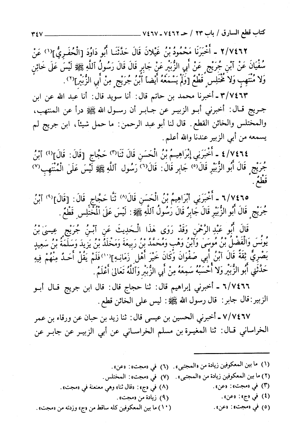 7465 - أخبرني إبراهيم بن الحسن قال ثنا حجاج قال قال بن جريج قال أبو الزبير قال جابر قال رسول الله صلى الله عليه و سلم : ليس على المختلس قطع قال أبو عبد الرحمن وقد روى هذا الحديث عن بن جريج عيسى بن يونس والفضل بن موسى وابن وهب ومحمد بن ربيعة ومخلد بن يزيد وسلمة بن سعيد بصرى ثقة قال بن أبي صفوان وكان خير أهل زمانه فلم يقل أحد منهم فيه حدثني أبو الزبير ولا أحسبه سمعه من أبي الزبير والله تعالى أعلم