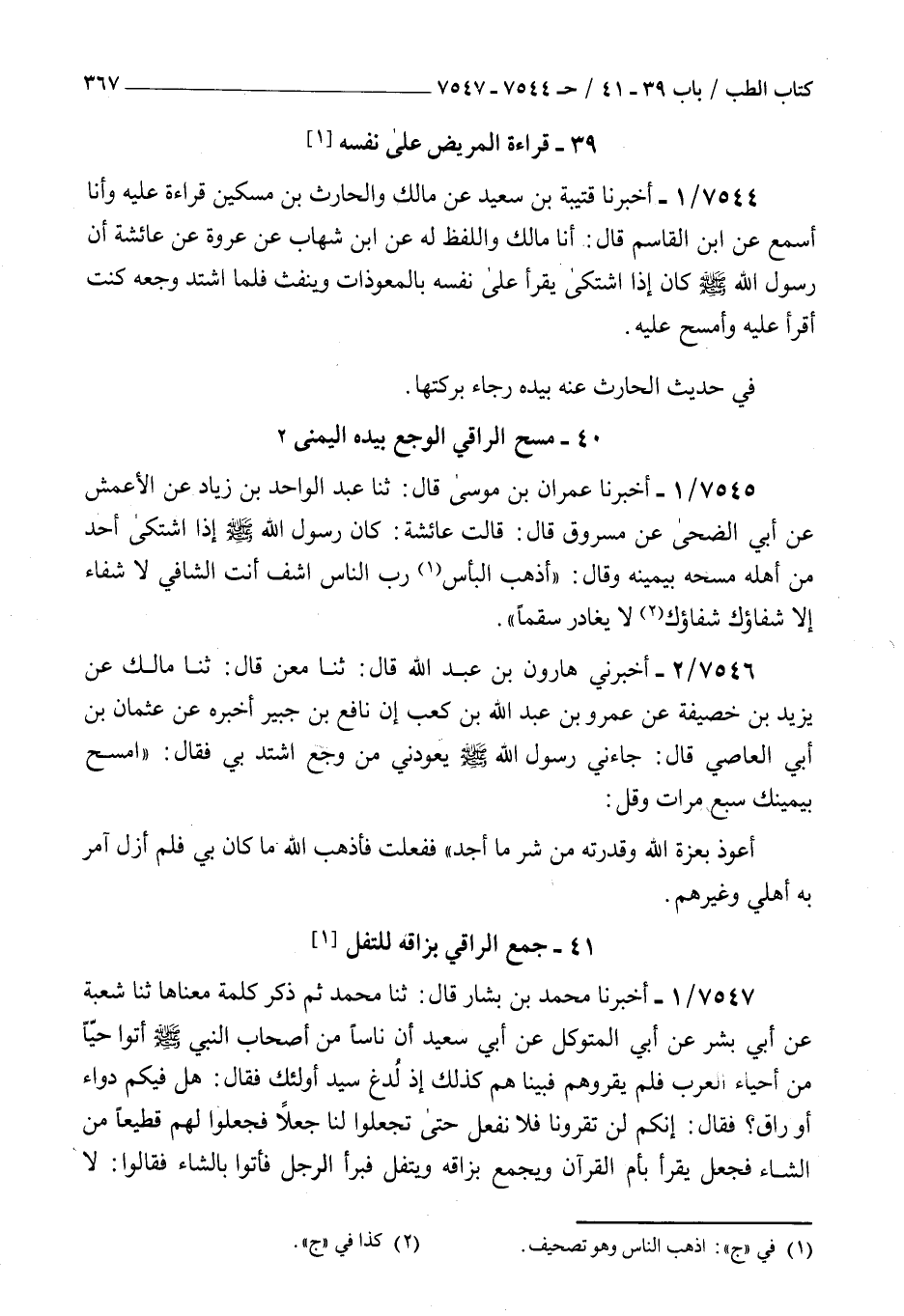7544 - أخبرنا قتيبة بن سعيد عن مالك والحارث بن مسكين قراءة عليه وأنا أسمع عن بن القاسم قال أنا مالك واللفظ له عن بن شهاب عن عروة عن عائشة : أن رسول الله صلى الله عليه و سلم كان إذا اشتكى يقرأ على نفسه بالمعوذات وينفث فلما اشتد وجعه كنت أقرأ عليه وأمسح عليه في حديث الحارث عنه بيده رجاء بركتها