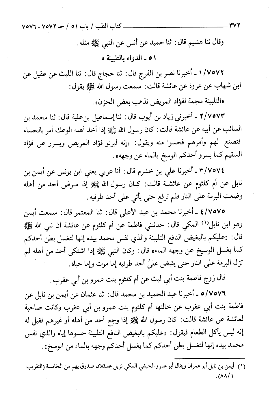 7572 - أخبرنا نصر بن الفرج قال ثنا حجاج قال ثنا الليث عن عقيل عن بن شهاب عن عروة عن عائشة قالت سمعت رسول الله صلى الله عليه و سلم يقول : التلبينة مجمة لفؤاد المريض تذهب بعض الحزن