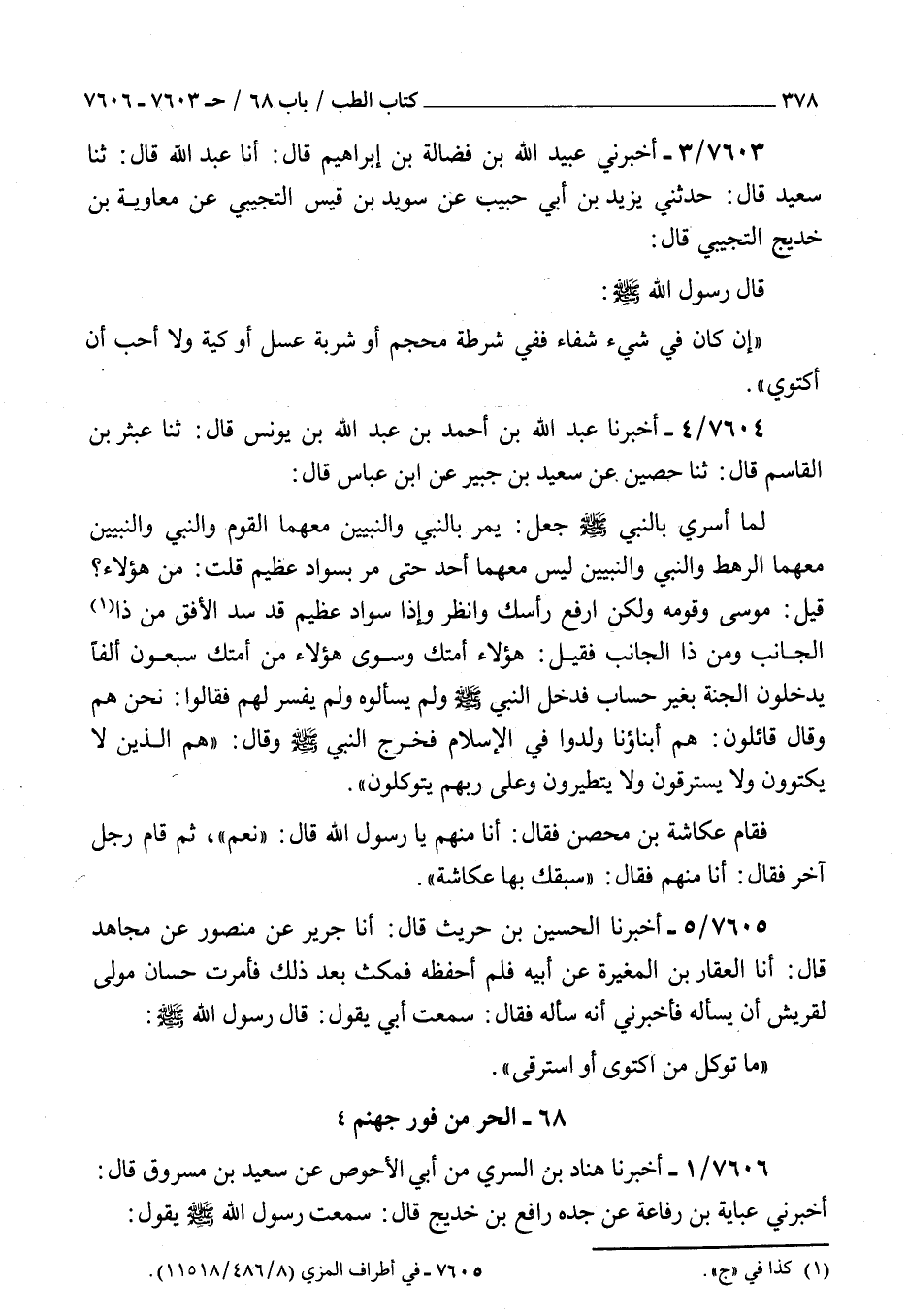 7604 - أخبرنا عبد الله بن أحمد بن عبد الله بن يونس قال ثنا عبثر بن القاسم قال ثنا حصين عن سعيد بن جبير عن بن عباس قال : لما أسري بالنبي صلى الله عليه و سلم جعل يمر بالنبي والنبيين معهما القوم والنبي والنبيين معهما الرهط والنبي والنبيين ليس معهما أحد حتى مر بسواد عظيم قلت من هؤلاء قيل موسى وقومه ولكن ارفع رأسك وانظر وإذا سواد عظيم قد سد الأفق من ذا الجانب ومن ذا الجانب فقيل هؤلاء أمتك وسوى هؤلاء من أمتك سبعون ألفا يدخلون الجنة بغير حساب فدخل النبي صلى الله عليه و سلم ولم يسألوه ولم يفسر لهم فقالوا نحن هم وقال قائلون هم أبناؤنا ولدوا في الإسلام فخرج النبي صلى الله عليه و سلم وقال هم الذين لا يكتوون ولا يسترقون ولا يتطيرون وعلى ربهم يتوكلون فقام عكاشة بن محصن فقال أنا منهم يا رسول الله قال نعم ثم قام رجل آخر فقال أنا منهم فقال سبقك بها عكاشة