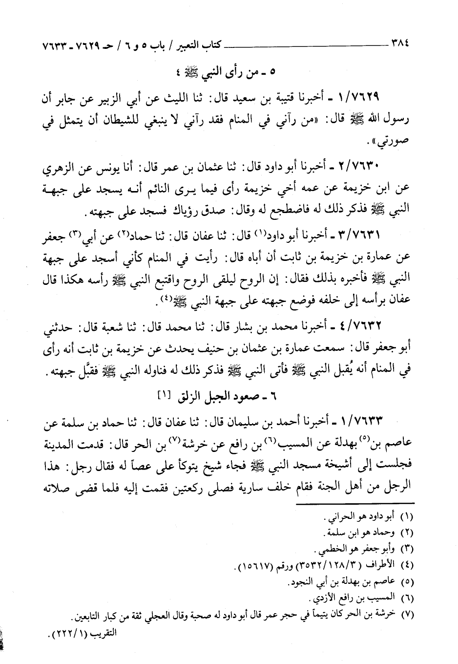 7631 - أخبرنا أبو داود قال ثنا عفان قال ثنا حماد عن أبي جعفر عن عمارة بن خزيمة بن ثابت أن أباه قال : رأيت في المنام كأني أسجد على جبهة النبي صلى الله عليه و سلم فأخبره بذلك فقال إن الروح ليلقى الروح واقتبع النبي صلى الله عليه و سلم رأسه هكذا قال عفان برأسه إلى خلفه فوضع جبهته على جبهة النبي صلى الله عليه و سلم