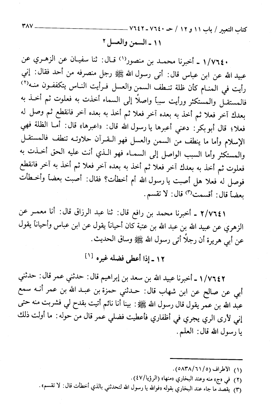 7640 - أخبرنا محمد بن منصور قال ثنا سفيان عن الزهري عن عبيد الله عن بن عباس قال : أتى رسول الله صلى الله عليه و سلم رجل منصرفه من أحد فقال إني رأيت في المنام كأن ظلة تنطف السمن والعسل فرأيت الناس يتكففون منه فالمستقل والمستكثر ورأيت سببا واصلا إلى السماء أخذت به فعلوت ثم أخذ به بعدك آخر فعلا ثم أخذ به بعده آخر فعلا ثم أخذ به بعده آخر فانقطع ثم وصل له فعلا قال أبو بكر دعني أعبرها يا رسول الله قال أعبرها قال أما الظلة فهي الإسلام وأما ما ينطف من السمن والعسل فهو القرآن حلاوته تنظف فالمستقل والمستكثر وأما السبب الواصل إلى السماء فهو الذي أنت عليه الحق أخذت به فعلوت ثم أخذ به بعدك آخر فعلا ثم أخذ به بعده آخر فعلا ثم أخذ به آخر فانقطع فوصل له فعلا هل أصبت يا رسول الله أم أخطأت فقال أصبت بعضا وأخطأت بعضا قال أقسمت قال لا تقسم
