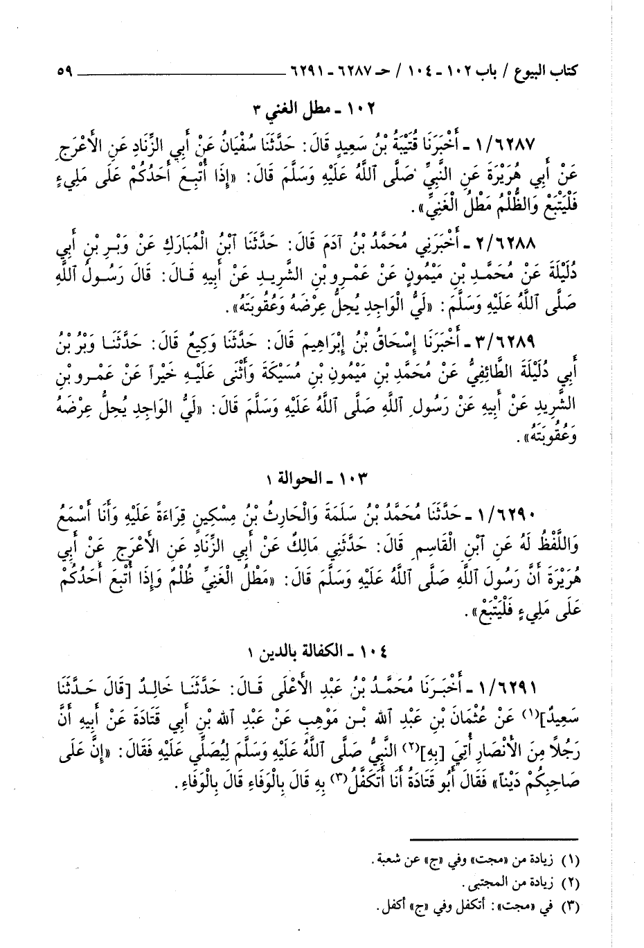 6287 - أخبرنا قتيبة بن سعيد قال حدثنا سفيان عن أبي الزناد عن الأعرج عن أبي هريرة عن النبي صلى الله عليه و سلم قال : إذا أتبع أحدكم على مليء فليتبع والظلم مطل الغني