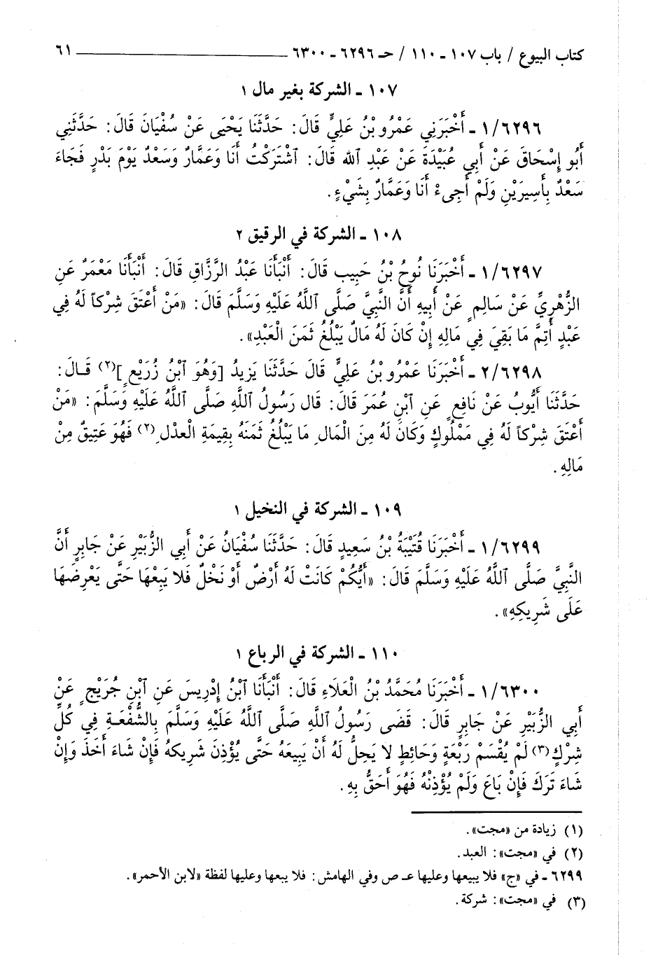 6299 - أخبرنا قتيبة بن سعيد قال حدثنا سفيان عن أبي الزبير عن جابر أن النبي صلى الله عليه و سلم قال : أيكم كانت له أرض أو نخل فلا يبعها حتى يعرضها على شريكه