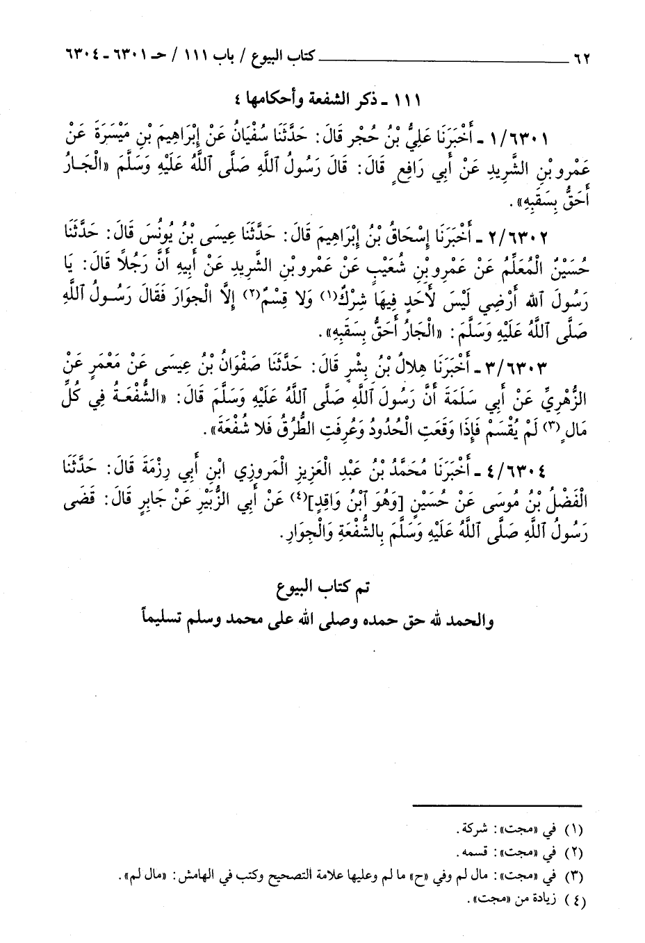 6301 - أخبرنا علي بن حجر قال حدثنا سفيان عن إبراهيم بن ميسرة عن عمرو بن الشريد عن أبي رافع قال قال رسول الله صلى الله عليه و سلم : الجار أحق بسقبه