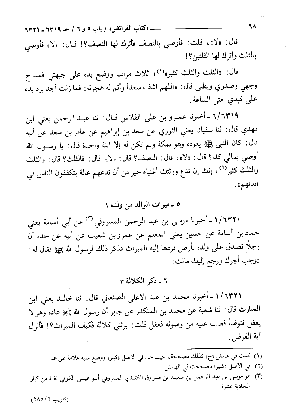 6319 - أخبرنا عمرو بن علي الفلاس قال ثنا عبد الرحمن يعني بن مهدي قال ثنا سفيان يعني الثوري عن سعد بن إبراهيم عن عامر بن سعد عن أبيه قال : كان النبي صلى الله عليه و سلم يعوده وهو بمكة ولم تكن له إلا ابنة واحدة قال يا رسول الله أوصي بمالي كله قال لا قال النصف قال لا قال فالثلث قال الثلث والثلث كثير إنك إن تدع ورثتك أغنياء خير من أن تدعهم عالة يتكففون الناس في أيديهم