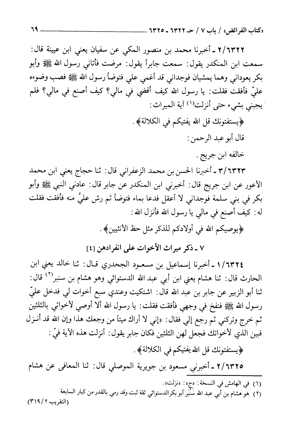 6322 - أخبرنا محمد بن منصور المكي عن سفيان يعني بن عيينة قال سمعت بن المنكدر يقول سمعت جابرا يقول : مرضت فأتاني رسول الله صلى الله عليه و سلم وأبو بكر يعوداني وهما يمشيان فوجداني قد أغمي علي فتوضأ رسول الله صلى الله عليه و سلم فصب وضوءه علي فأفقت فقلت يا رسول الله كيف أقضي في مالي كيف أصنع في مالي فلم يجبني بشيء حتى أنزلت آية الميراث { يستفتونك قل الله يفتيكم في الكلالة } قال أبو عبد الرحمن خالفة بن جريج