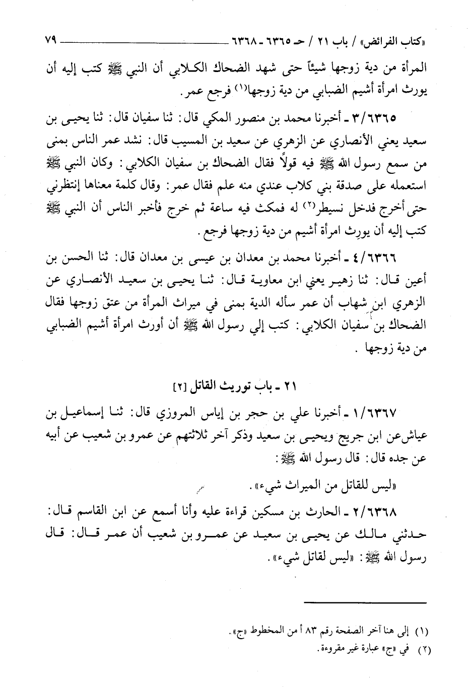 6365 - أخبرنا محمد بن منصور المكي قال ثنا سفيان قال ثنا يحيى بن سعيد يعني الأنصاري عن الزهري عن سعيد بن المسيب قال : نشد عمر الناس بمنى من سمع رسول الله صلى الله عليه و سلم فيه قولا فقال الضحاك بن سفيان الكلابي وكان النبي صلى الله عليه و سلم استعمله على صدقة بني كلاب عندي منه علم فقال عمر وقال كلمة معناها انتظرني حتى أخرج فدخل نسيطر له فمكث فيه ساعة ثم خرج فأخبر الناس أن النبي صلى الله عليه و سلم كتب إليه أن يورث امرأة أشيم من دية زوجها فرجع