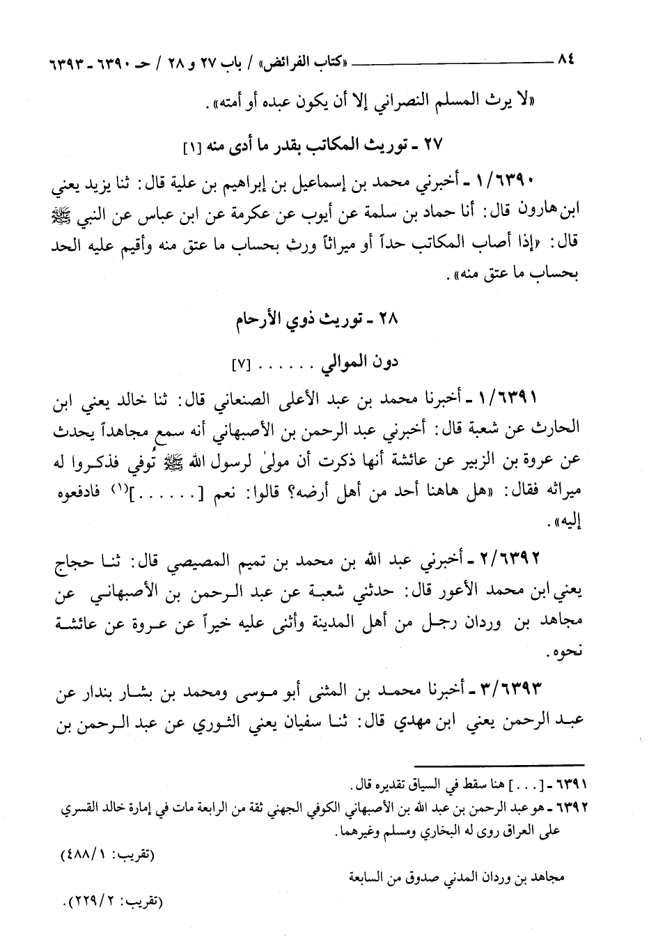 6393 - أخبرنا محمد بن المثنى أبو موسى ومحمد بن بشار بندار عن عبد الرحمن يعني بن مهدي قال ثنا سفيان يعني الثوري عن عبد الرحمن بن الأصبهاني عن مجاهد بن وردان عن عروة بن الزبير عن عائشة : أن مولى للنبي صلى الله عليه و سلم خر من عذق نخلة فمات فأتى النبي صلى الله عليه و سلم بميراثه فقال هل له من رحم أو نسب قالوا لا قال انظروا بعض أهله وقال بن بشار أهل قومه فأعطوه إياه