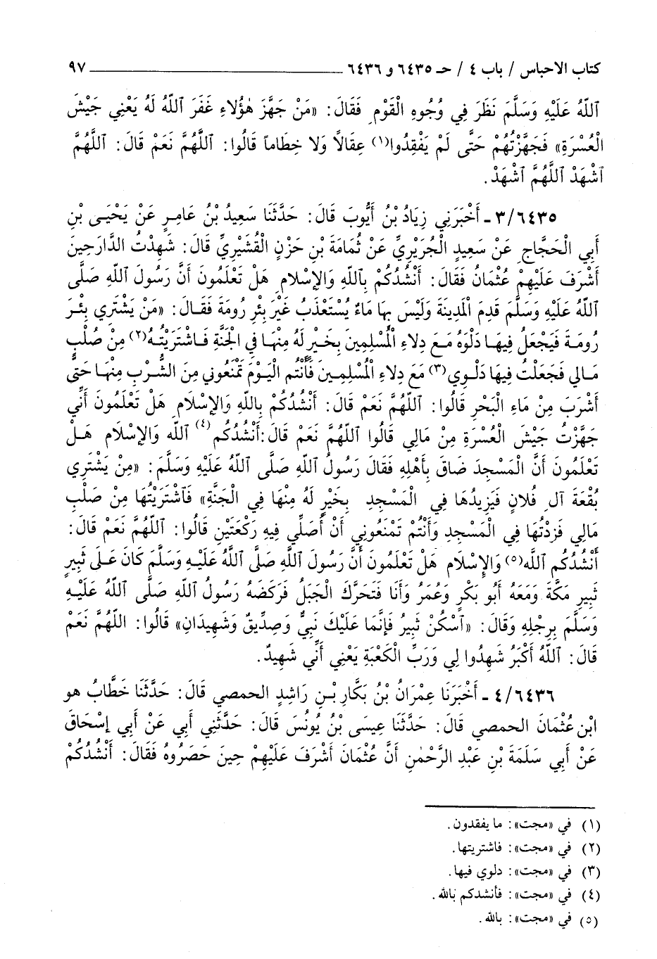 6436 - أخبرنا عمران بن بكار بن راشد الحمصي قال حدثنا خطاب هو بن عثمان الحمصي قال حدثنا عيسى بن يونس قال حدثني أبي عن أبي إسحاق عن أبي سلمة بن عبد الرحمن : أن عثمان أشرف عليهم حين حصروه فقال أنشدكم بالله رجلا سمع من رسول الله صلى الله عليه و سلم يقول يوم الجبل حين اهتز فركله برجله وقال اسكن فإنه ليس عليك إلا نبي أو صديق أو شهيد وأنا معه قال فانتشد له رجال ثم قال انشد بالله رجلا شهد رسول الله صلى الله عليه و سلم يوم بيعة الرضوان يقول هذه يد الله وهذه يد عثمان فانتشد له رجال ثم قال انشد بالله رجلا سمع رسول الله صلى الله عليه و سلم يوم جيش العسرة يقول من ينفق نفقة متقبلة فجهزت نصف الجيش من مالي فأنشد له رجال ثم قال أنشد بالله رجلا سمع رسول الله صلى الله عليه و سلم يقول من يزيد في هذا المسجد ببيت في الجنة فاشتريته من مالي فانتشد له رجال ثم قال أنشد بالله رجلا شهد رومة تباع فاشتريتها من مالي فأبحتها لابن السبيل فانتشد له رجال