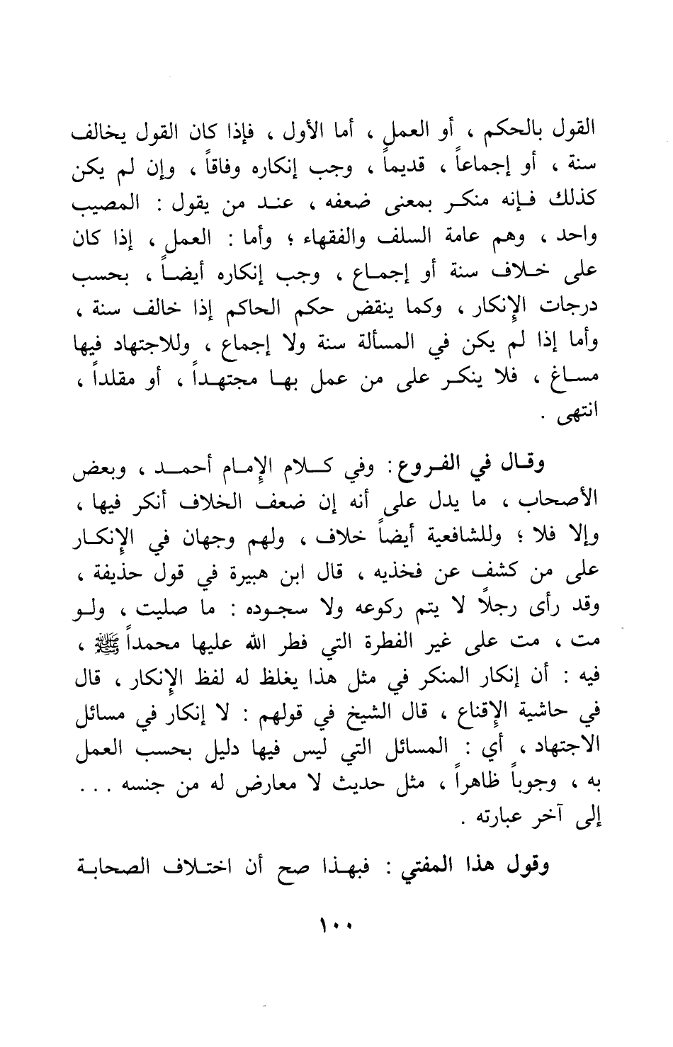 وقال في الفروع: وفي كلام الإمام أحمد وبعض الأصحاب، ما يدل على أنه إن ضعف الخلاف أنكر فيها، وإلا فلا; وللشافعية أيضاً خلاف، ولهم وجهان في الإنكار على من كشف عن فخذيه؛ قال ابن هبيرة في قول حذيفة، وقد رأى رجلاً لا يتم ركوعه ولا سجوده: "ما صليت، ولو مت مت على غير الفطرة التي فطر الله عليها محمداً صلى الله عليه وسلم "، فيه: أن إنكار المنكر في مثل هذا يغلظ له لفظ الإنكار؛ قال في حاشية الإقناع:، قال الشيخ في قولهم: لا إنكار في مسائل الاجتهاد، أي: المسائل التي ليس فيها دليل بحسب العمل به، وجوباً ظاهراً، مثل حديث لا معارض له من جنسه ... إلى آخر عبارته.