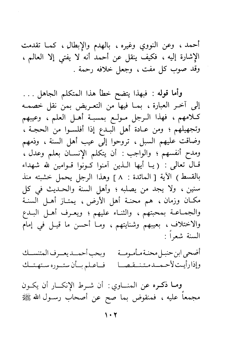 وأما قوله: فبهذا يتضح خطأ هذا المتكلم الجاهل ... إلى آخر العبارة، بما فيها من التعريف بمن نقل خصمه كلامهم، فهذا الرجل مولع بمسبة أهل العلم، وعيبهم وتجهيلهم؛ ومن عادة أهل البدع إذا أفلسوا من الحجة، وضاقت عليهم السبل، تروحوا إلى عيب أهل السنة وذمهم، ومدح أنفسهم؛ والواجب أن يتكلم الإنسان بعلم وعدل، قال تعالى: {يَا أَيُّهَا الَّذِينَ آمَنُوا كُونُوا قَوَّامِينَ لِلَّهِ شُهَدَاءَ بِالْقِسْطِ} الآية [سورة المائدة آية: 8] . وهذا الرجل يحمل خشبته منذ سنين، ولا يجد من يصلبه، وأهل السنة والحديث في كل مكان وزمان، هم محنة أهل الأرض، يمتاز أهل السنة والجماعة بمحبتهم، والثناء عليهم، ويعرف أهل البدع والاختلاف، بعيبهم وشنايتهم، وما أحسن ما قيل في إمام السنة، شعراً: