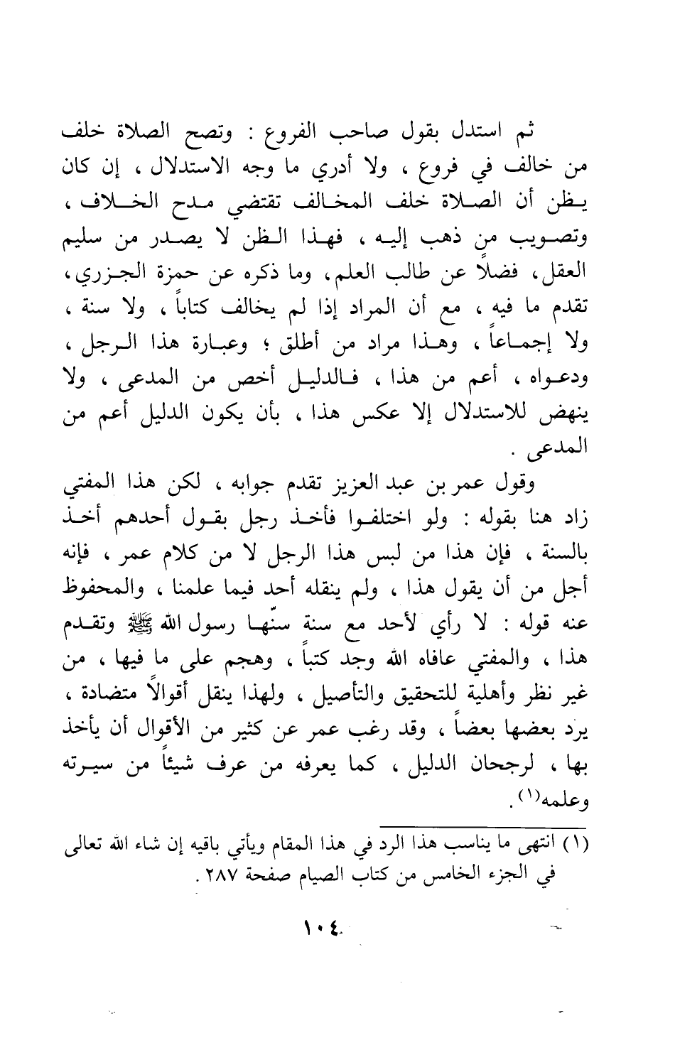 ثم استدل بقول صاحب الفروع: وتصح الصلاة خلف من خالف في فروع، ولا أدري ما وجه الاستدلال إن كان يظن أن الصلاة خلف المخالف تقتضي مدح الخلاف، وتصويب من ذهب إليه، فهذا الظن لا يصدر من سليم العقل، فضلاً عن طالب العلم. وما ذكره عن حمزة الجزري، تقدم ما فيه، مع أن المراد إذا لم يخالف كتاباً ولا سنة ولا إجماعاً، وهذا مراد من أطلق؛ وعبارة هذا الرجل ودعواه، أعم من هذا، فالدليل أخص من المدعى، ولا ينهض للاستدلال إلا عكس هذا، بأن يكون الدليل أعم من المدعى.