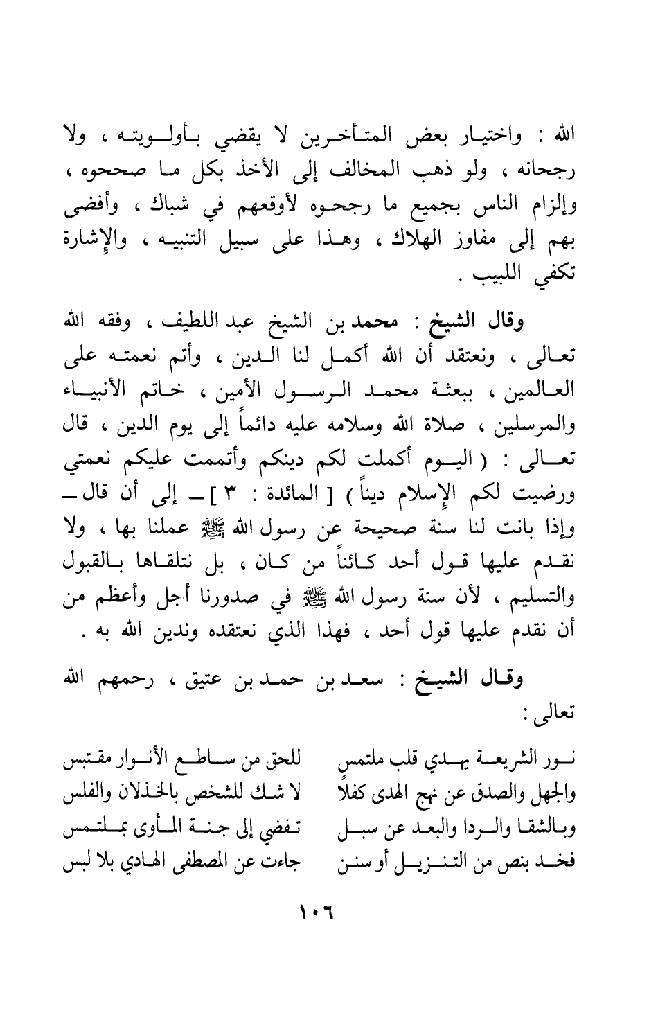 وقال الشيخ محمد بن الشيخ عبد اللطيف، وفقه الله تعالى: ونعتقد أن الله أكمل لنا الدين، وأتم نعمته على العالمين، ببعثة محمد الرسول الأمين، خاتم الأنبياء والمرسلين، صلاة الله وسلامه عليه دائماً إلى يوم الدين؛ قال تعالى: {الْيَوْمَ أَكْمَلْتُ لَكُمْ دِينَكُمْ وَأَتْمَمْتُ عَلَيْكُمْ نِعْمَتِي وَرَضِيتُ لَكُمُ الأِسْلامَ دِيناً} [سورة المائدة آية: 3]- إلى أن قال- وإذا بانت لنا سنة صحيحة عن رسول الله صلى الله عليه وسلم عملنا بها، ولا نقدم عليها قول أحد كائناً من كان؛ بل نتلقاها بالقبول والتسليم، لأن سنة رسول الله صلى الله عليه وسلم في صدورنا أجل وأعظم من أن نقدم عليها قول أحد؛ فهذا الذي نعتقده وندين الله به.