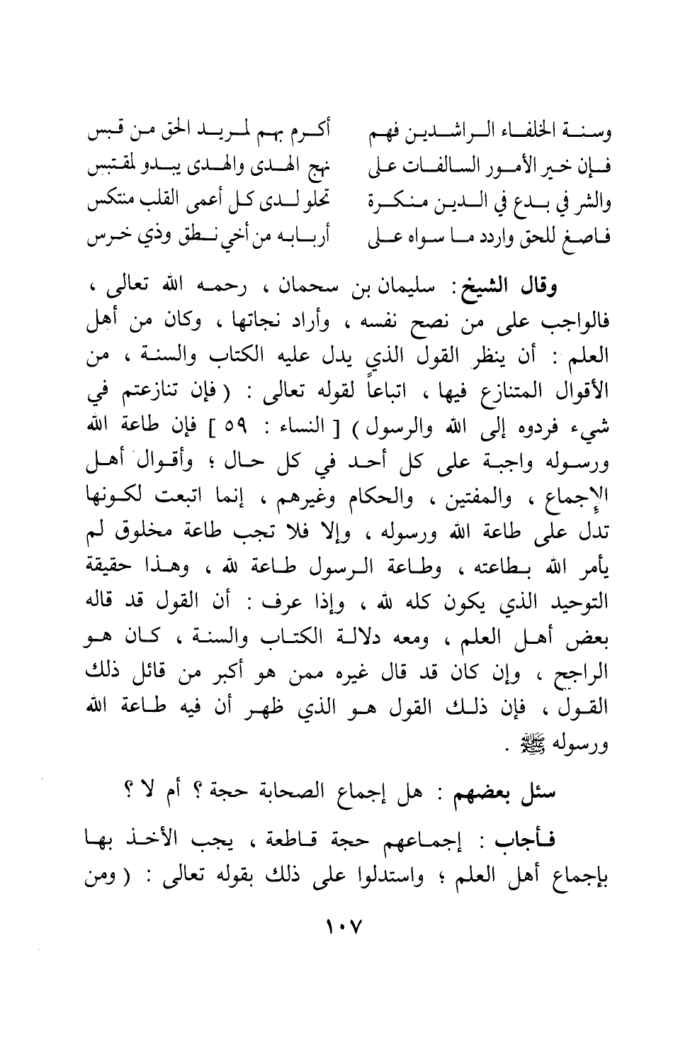 وقال الشيخ: سليمان بن سحمان، رحمه الله تعالى: فالواجب على من نصح نفسه، وأراد نجاتها، وكان من أهل العلم: أن ينظر القول الذي يدل عليه الكتاب والسنة من الأقوال المتنازع فيها، اتباعاً لقوله تعالى: {فَإِنْ تَنَازَعْتُمْ فِي شَيْءٍ فَرُدُّوهُ إِلَى اللَّهِ وَالرَّسُولِ} [سورة النساء آية: 59] ؛ فإن طاعة الله ورسوله واجبة على كل أحد في كل حال; وأقوال أهل الإجماع، والمفتين، والحكام وغيرهم، إنما اتبعت لكونها تدل على طاعة الله ورسوله، وإلا فلا تجب طاعة مخلوق لم يأمر الله بطاعته؛ وطاعة الرسول طاعة لله. وهذا حقيقة التوحيد الذي يكون كله لله؛ وإذا عرف أن القول قد قاله بعض أهل العلم، ومعه دلالة الكتاب والسنة، كان هو الراجح؛ وإن كان قد قال غيره ممن هو أكبر من قائل ذلك القول، فإن ذلك القول هو الذي ظهر أن فيه طاعة الله ورسوله صلى الله عليه وسلم.