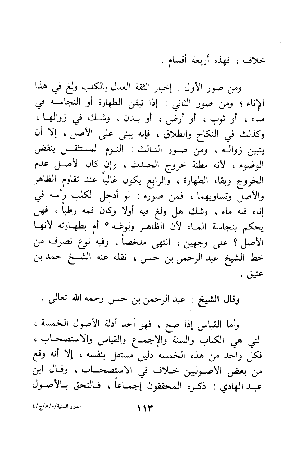 وقال الشيخ عبد الرحمن بن حسن، رحمه الله تعالى: وأما القياس إذا صح، فهو أحد أدلة الأصول الخمسة، التي هي الكتاب والسنة والإجماع والقياس والاستصحاب؛ فكل واحد من هذه الخمسة دليل مستقل بنفسه، إلا أنه وقع من بعض الأصوليين خلاف في الاستصحاب. وقال ابن عبد الهادي: ذكره المحققون إجماعاً، فالتحق بالأصول