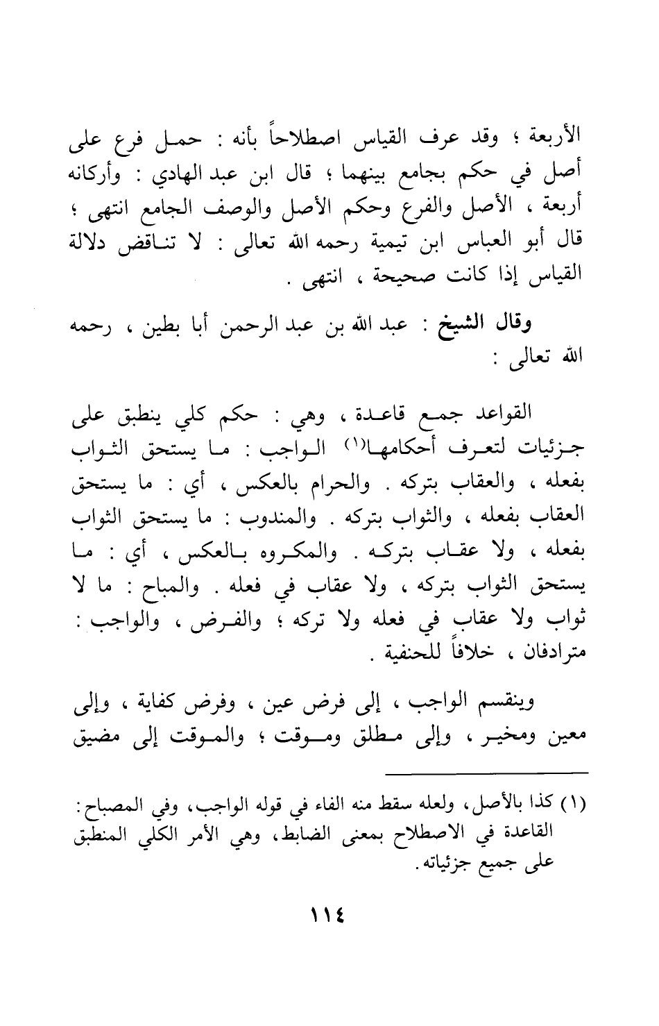 وقال الشيخ عبد الله بن عبد الرحمن أبا بطين، رحمه الله تعالى: القواعد جمع قاعدة، وهي: حكم كلي ينطبق على جزئيات لتعرف أحكامها 1. الواجب: ما يستحق الثواب بفعله، والعقاب بتركه. والحرام بالعكس، أي: ما يستحق العقاب بفعله، والثواب بتركه. والمندوب: ما يستحق الثواب بفعله، ولا عقاب بتركه. والمكروه بالعكس، أي: ما يستحق الثواب بتركه، ولا عقاب في فعله. والمباح: ما لا ثواب ولا عقاب في فعله ولا تركه. والفرض، والواجب: مترادفان، خلافاً للحنفية.