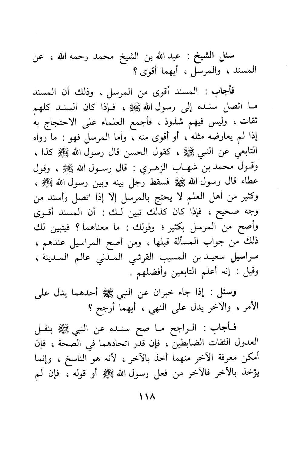 سئل الشيخ عبد الله بن الشيخ محمد، رحمه الله: عن المسند والمرسل، أيهما أقوى؟