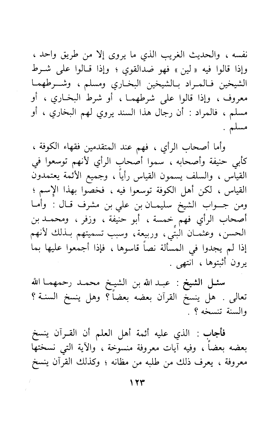 ومن جواب الشيخ سليمان بن علي بن مشرف، قال: وأما أصحاب الرأي فهم خمسة: أبو حنيفة، وزفر، ومحمد بن الحسن، وعثمان البتي، وربيعة؛ وسبب تسميتهم بذلك لأنهم إذا لم يجدوا في المسألة نصاً قاسوها، فإذا أجمعوا عليها بما يرون أثبتوها. انتهى.