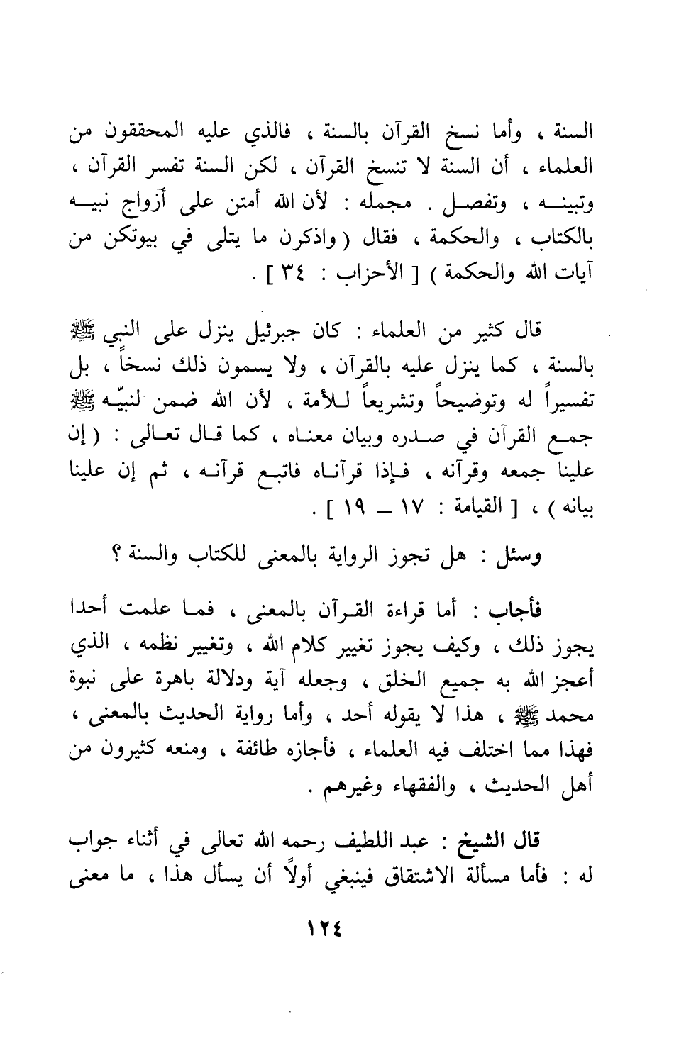 فأجاب: أما قراءة القرآن بالمعنى، فما علمت أحداً يجوز ذلك، وكيف يجوز تغيير كلام الله، وتغيير نظمه الذي أعجز الله به جميع الخلق، وجعله آية ودلالة باهرة على نبوة محمد صلى الله عليه وسلم؟ هذا لا يقوله أحد. وأما رواية الحديث بالمعنى، فهذا مما اختلف فيه العلماء؛ فأجازه طائفة، ومنعه كثيرون من أهل الحديث، والفقهاء وغيرهم.