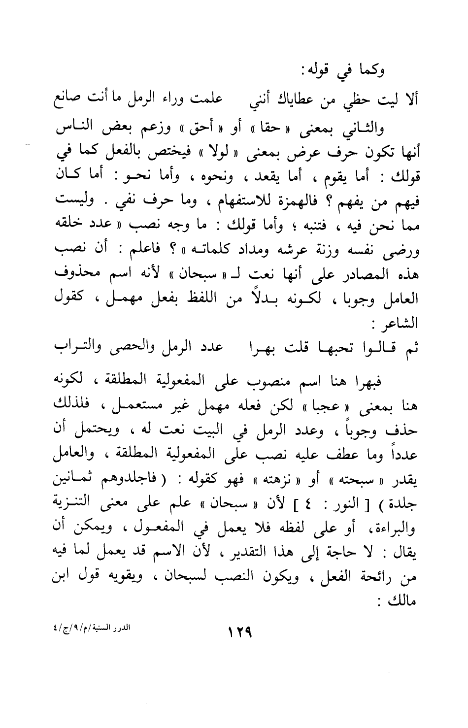 والثاني بمعنى: "حقاً" أو "أحق"، وزعم بعض الناس أنها تكون حرف عرض بمعنى "لولا"، فيختص بالفعل كما في قولك: أما يقوم، أما يقعد، ونحوه. و"أما" نحو: أما كان فيهم من يفهم؟ فالهمزة للاستفهام، وما: حرف نفي؛ وليست مما نحن فيه، فتنبه! وأما قولك: ما وجه نصب "عدد خلقه ورضى نفسه وزنة عرشه ومداد كلماته"؟ فاعلم: أن نصب هذه المصادر على أنها نعت لـ"سبحان"، لأنه اسم محذوف العامل وجوباً، لكونه بدلاً من اللفظ بفعل مهمل، كقول الشاعر:
