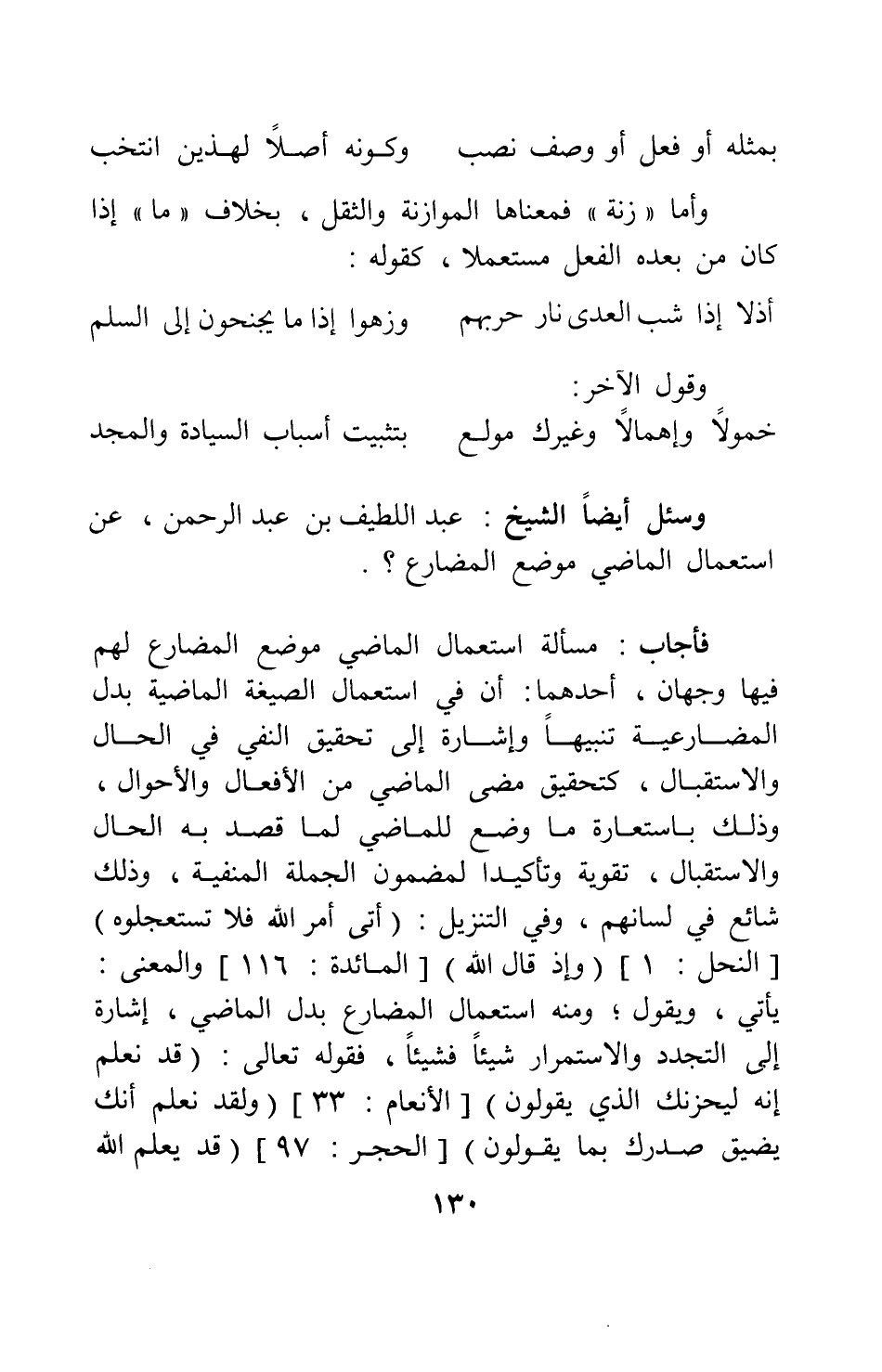 وسئل أيضاً: الشيخ عبد اللطيف بن عبد الرحمن: عن استعمال الماضي موضع المضارع؟