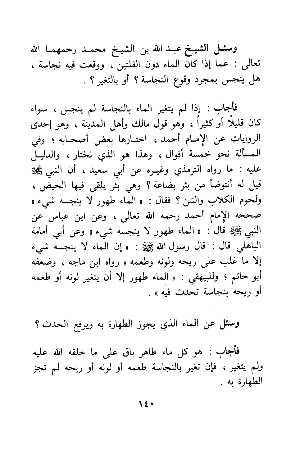 وسئل الشيخ عبد الله بن الشيخ محمد، رحمهما الله تعالى: عما إذا كان الماء دون القلتين، ووقعت فيه نجاسة، هل ينجس بمجرد وقوع النجاسة؟ أو بالتغير؟