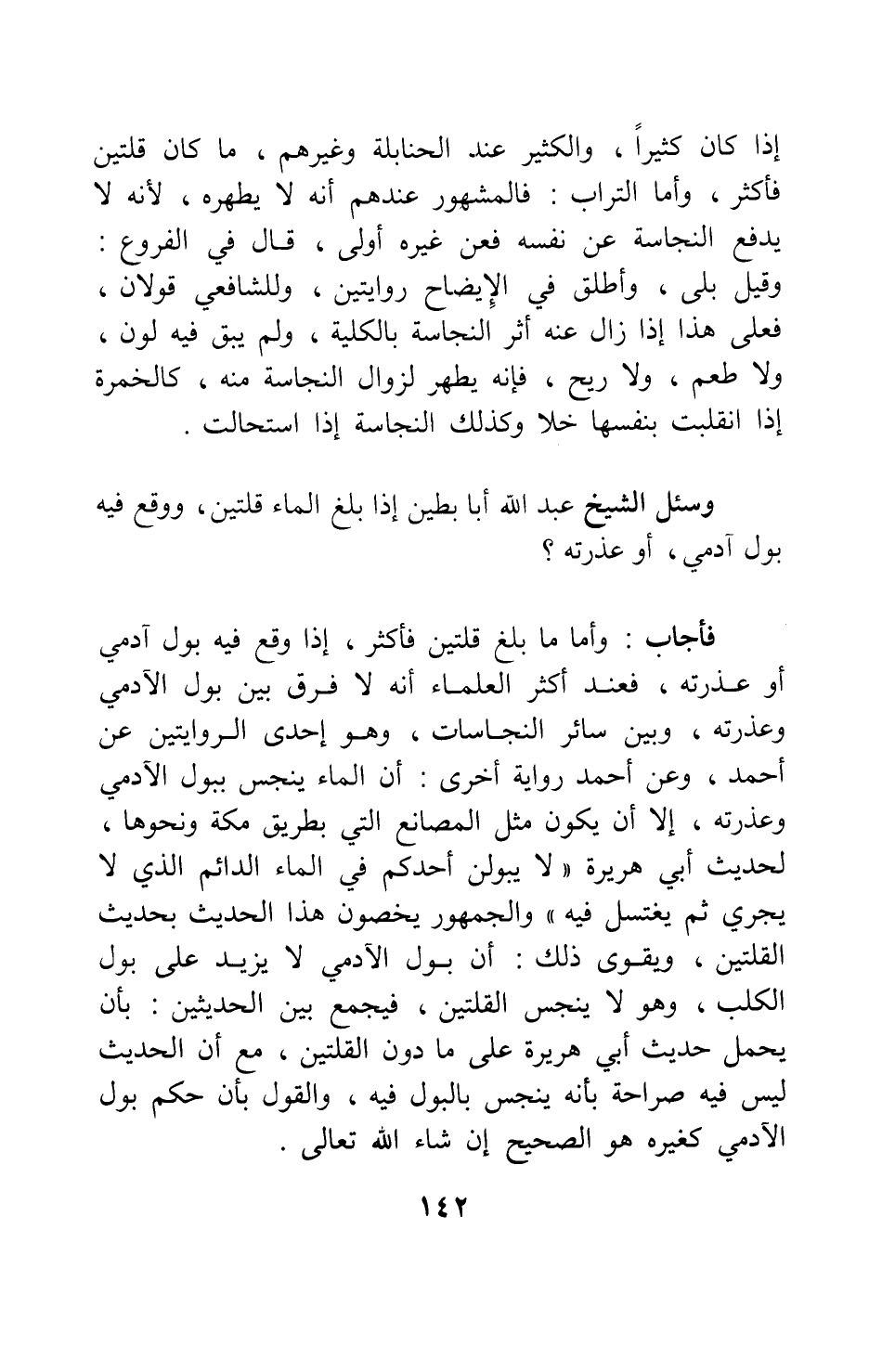 فأجاب: وأما ما بلغ قلتين فأكثر، إذا وقع فيه بول آدمي أو عذرته، فعند أكثر العلماء أنه لا فرق بين بول الآدمي وعذرته، وبين سائر النجاسات؛ وهو إحدى الروايتين عن أحمد. وعن أحمد رواية أخرى: أن الماء ينجس ببول الآدمي وعذرته، إلا أن يكون مثل المصانع التي بطريق مكة ونحوها، لحديث أبي هريرة " لا يبولن أحدكم في الماء الدائم الذي لا يجري ثم يغتسل فيه " 1. والجمهور يخصون هذا الحديث بحديث القلتين، ويقوي ذلك: أن بول الآدمي لا يزيد على بول الكلب، وهو لا ينجس القلتين؛ فيجمع بين الحديثين: بأن يحمل حديث أبي هريرة على ما دون القلتين، مع أن الحديث ليس فيه صراحة بأنه ينجس بالبول فيه؛ والقول بأن حكم بول الآدمي كغيره هو الصحيح إن شاء الله تعالى.