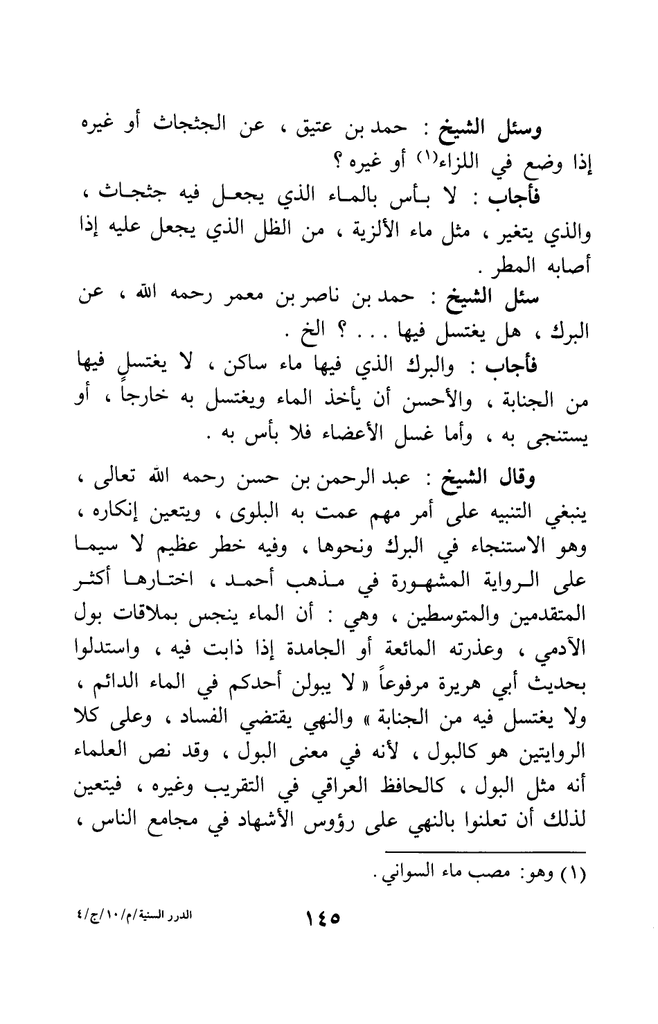 وقال الشيخ عبد الرحمن بن حسن، رحمه الله تعالى: ينبغي التنبيه على أمر مهم عمت به البلوى ويتعين إنكاره، وهو الاستنجاء في البرك ونحوها، وفيه خطر عظيم لا سيما على الرواية المشهورة في مذهب أحمد، اختارها أكثر المتقدمين والمتوسطين، وهي: أن الماء ينحس بملاقاة بول الآدمي، وعذرته المائعة أو الجامدة إذا ذابت فيه، واستدلوا بحديث أبي هريرة مرفوعاً: " لا يبولن أحدكم في الماء الدائم، ولا يغتسل فيه من الجنابة " 2؛ والنهي يقتضي الفساد. وعلى كلا الروايتين هو كالبول، لأنه في معنى البول؛ وقد نص العلماء أنه مثل البول، كالحافظ العراقي في التقريب وغيره، فيتعين لذلك أن تعلنوا بالنهي على رؤوس الأشهاد في مجامع الناس،