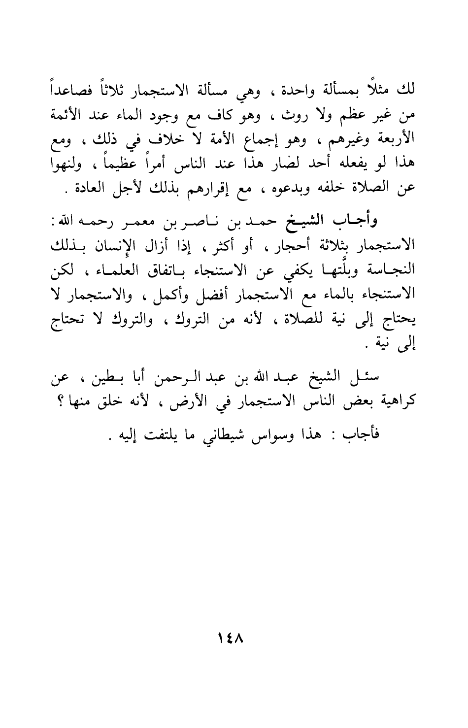 وأجاب الشيخ حمد بن ناصر بن معمر، رحمه الله: الاستجمار بثلاثة أحجار أو أكثر، إذا أزال الإنسان بذلك النجاسة وبلتها يكفي عن الاستنجاء باتفاق العلماء، لكن الاستنجاء بالماء مع الاستجمار أفضل وأكمل؛ والاستجمار لا يحتاج إلى نية للصلاة، لأنه من التروك، والتروك لا تحتاج إلى نية.