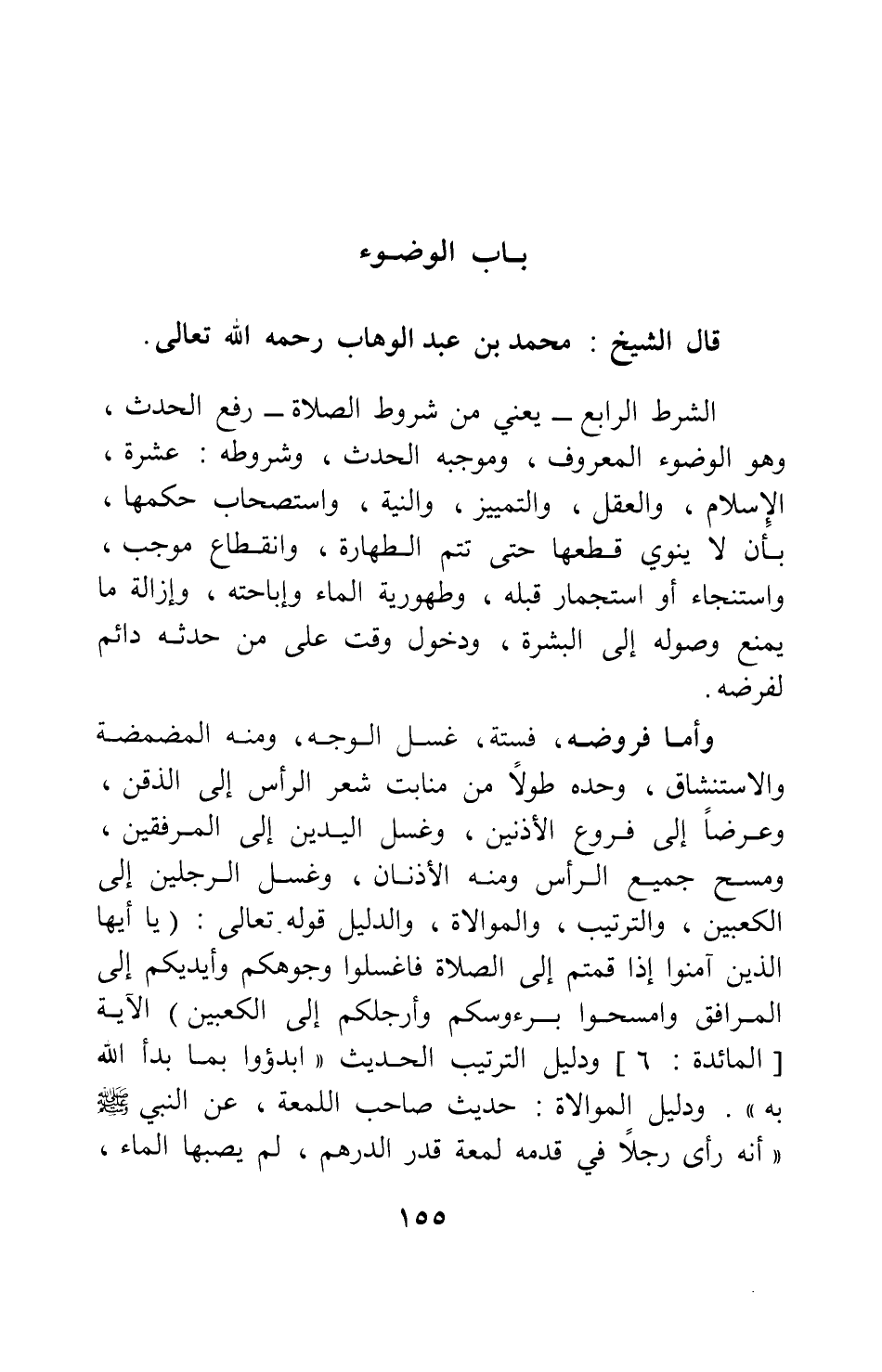 قال الشيخ محمد بن عبد الوهاب، رحمه الله تعالى: الشرط الرابع - يعني من شروط الصلاة -: رفع الحدث، وهو الوضوء المعروف؛ وموجبه الحدث؛ وشروطه عشرة: الإسلام، والعقل، والتمييز، والنية، واستصحاب حكمها، بأن لا ينوي قطعها حتى تتم الطهارة، وانقطاع موجب، واستنجاء أو استجمار قبله، وطهورية الماء وإباحته، وإزالة ما يمنع وصوله إلى البشرة، ودخول وقت على من حدثه دائم لفرضه.