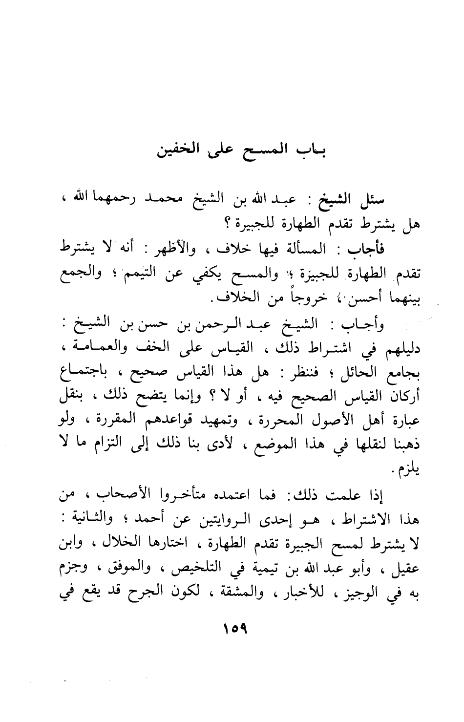 وأجاب الشيخ عبد الرحمن بن حسن بن الشيخ: دليلهم في اشتراط ذلك: القياس على الخف والعمامة، بجامع الحائل؛ فننظر: هل هذا القياس صحيح باجتماع أركان القياس الصحيح فيه، أو لا؟ وإنما يتضح ذلك بنقل عبارة أهل الأصول المحررة، وتمهيد قواعدهم المقررة؛ ولو ذهبنا لنقلها في هذا الموضع، لأدى بنا ذلك إلى التزام ما لا يلزم. إذا علمت ذلك، فما اعتمده متأخرو الأصحاب من هذا الاشتراط، هو إحدى الروايتين عن أحمد؛ والثانية: لا يشترط لمسح الجبيرة تقدم الطهارة، اختارها الخلال، وابن عقيل، وأبو عبد الله ابن تيمية في التلخيص، والموفق، وجزم به في الوجيز، للأخبار، والمشقة، لكون الجرح قد يقع في