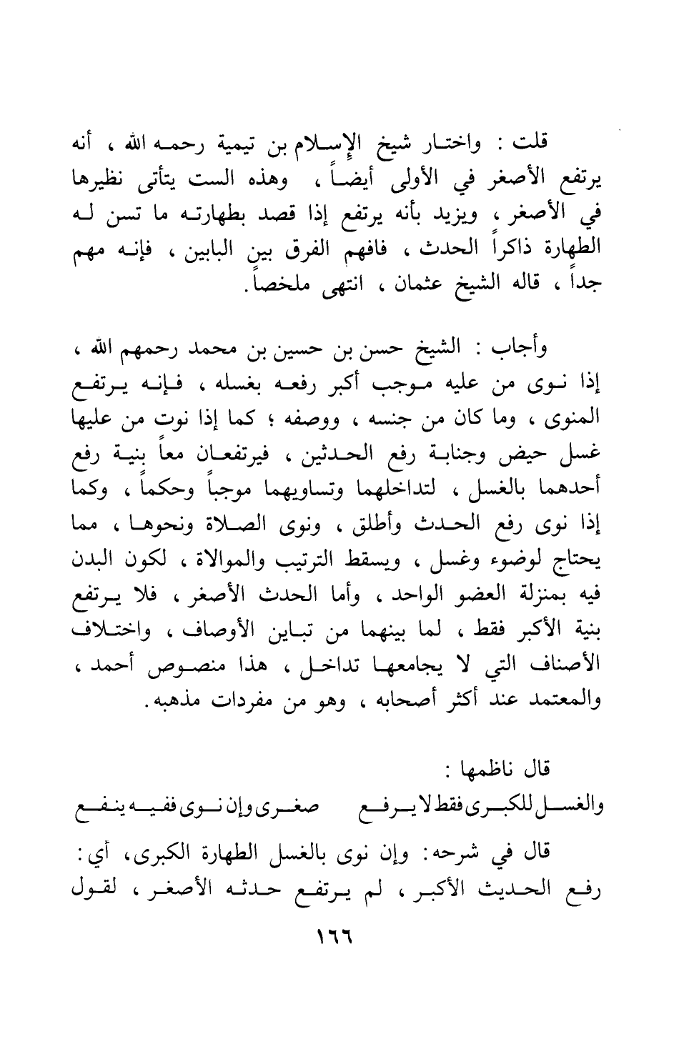 وأجاب الشيخ حسن بن حسين بن محمد، رحمهم الله: إذا نوى من عليه موجب أكبر رفعه بغسله، فإنه يرتفع المنوي وما كان من جنسه، ووصفه، كما إذا نوت من عليها غسل حيض وجنابة رفع الحدثين، فيرتفعان معاً بنية رفع أحدهما بالغسل، لتداخلهما وتساويهما موجباً وحكماً، وكما إذا نوى رفع الحدث وأطلق، ونوى الصلاة ونحوها، مما يحتاج لوضوء وغسل، ويسقط الترتيب والموالاة، لكون البدن فيه بمنْزلة العضو الواحد. وأما الحدث الأصغر، فلا يرتفع بنية الأكبر فقط، لما بينهما من تباين الأوصاف، واختلاف الأصناف التي لا يجامعها تداخل؛ هذا منصوص أحمد، والمعتمد عند أكثر أصحابه، وهو من مفردات مذهبه. قال ناظمها: