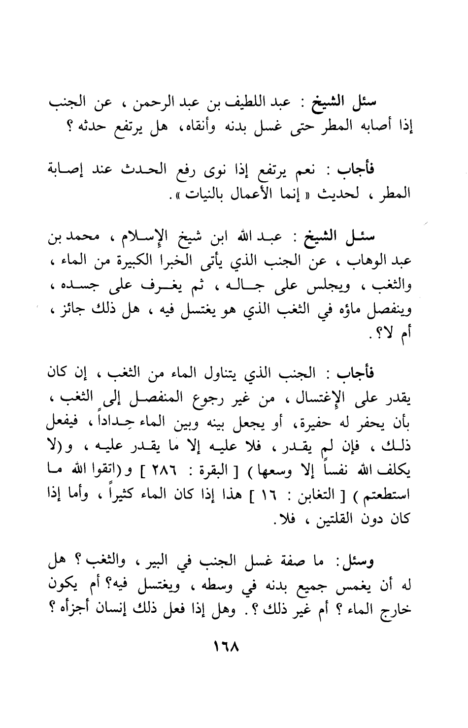 سئل الشيخ عبد الله بن شيخ الإسلام محمد بن عبد الوهاب: عن الجنب الذي يأتي الخبرا الكبيرة من الماء، والثغب، ويجلس على جاله، ثم يغرف على جسده، وينفصل ماؤه في الثغب الذي هو يغتسل فيه، هل ذلك جائز، أم لا؟