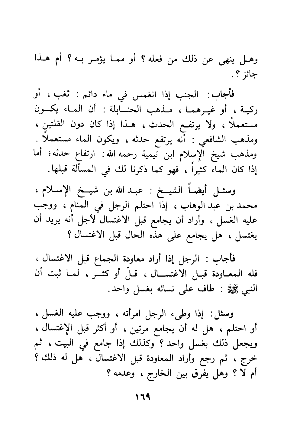 وسئل أيضاً: الشيخ عبد الله بن شيخ الإسلام محمد بن عبد الوهاب: إذا احتلم الرجل في المنام، ووجب عليه الغسل، وأراد أن يجامع قبل الاغتسال لأجل أنه يريد أن يغتسل، هل يجامع على هذه الحال قبل الاغتسال؟