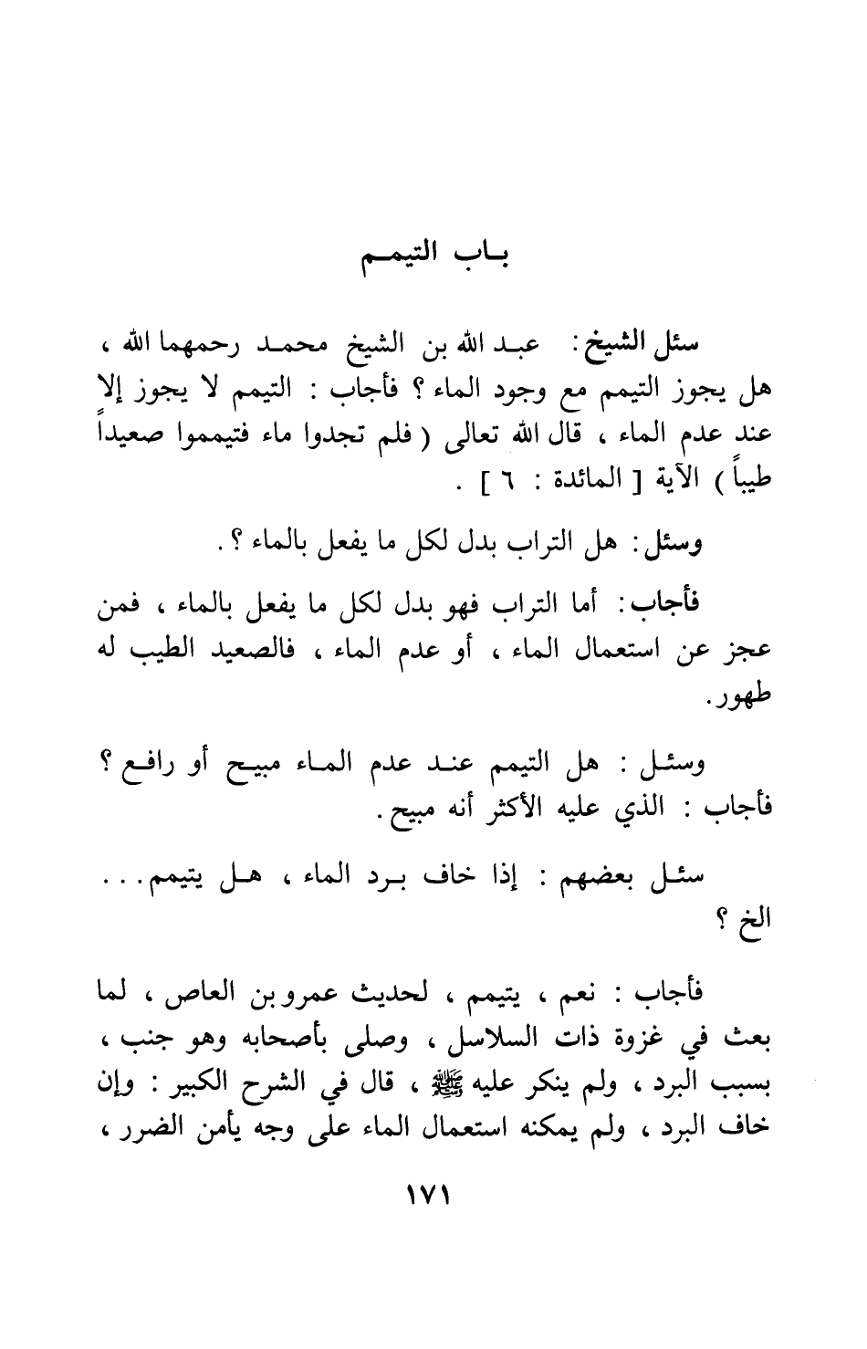 سئل الشيخ عبد الله بن الشيخ محمد، رحمهما الله: هل يجوز التيمم مع وجود الماء؟
