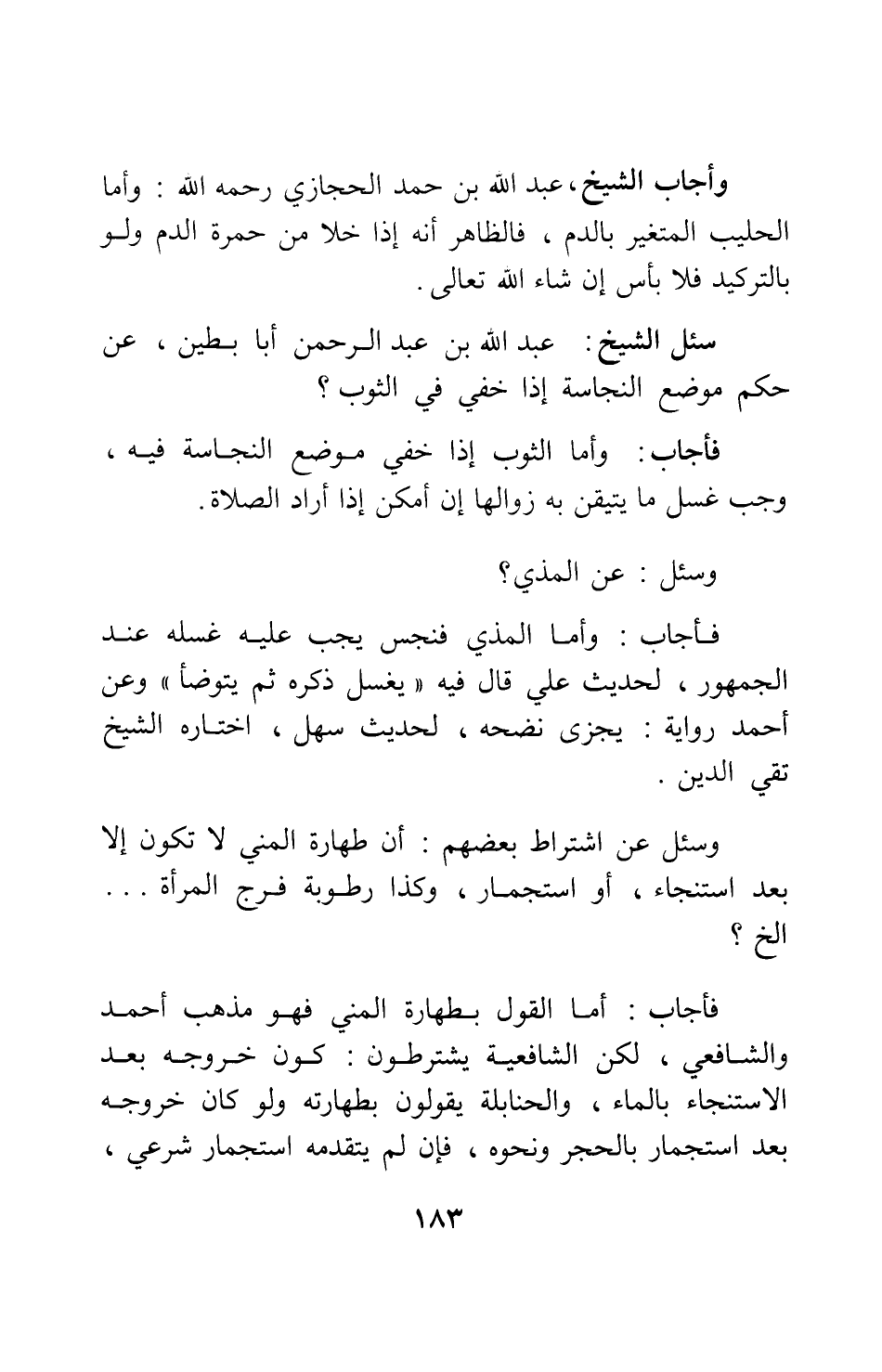فأجاب: وأما المذي فنجس يجب عليه غسله عند الجمهور، لحديث علي قال فيه: " يغسل ذكره ثم يتوضأ " 1، وعن أحمد رواية: يجزئ نضحه، لحديث سهل، اختاره الشيخ تقي الدين.