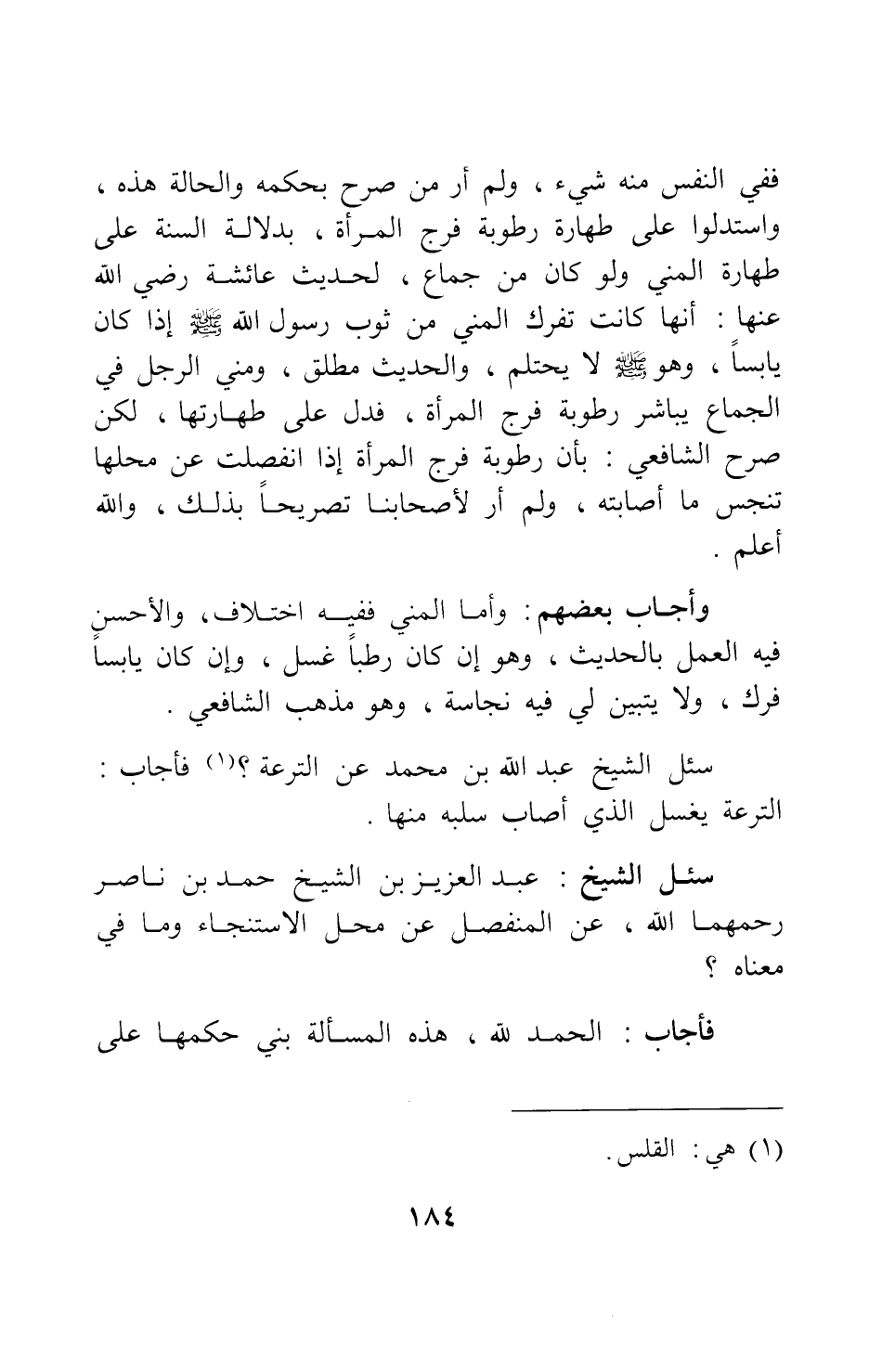 سئل الشيخ عبد العزيز بن الشيخ حمد بن ناصر، رحمهما الله: عن المنفصل عن محل الاستنجاء وما في معناه؟