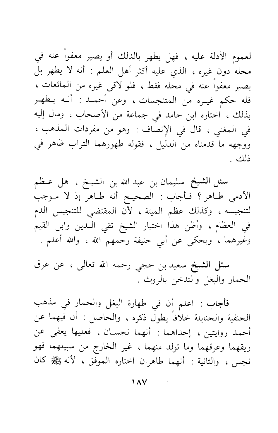 سئل الشيخ سعيد بن حجي، رحمه الله تعالى: عن عَرَق الحمار والبغل والتدخن بالروث.