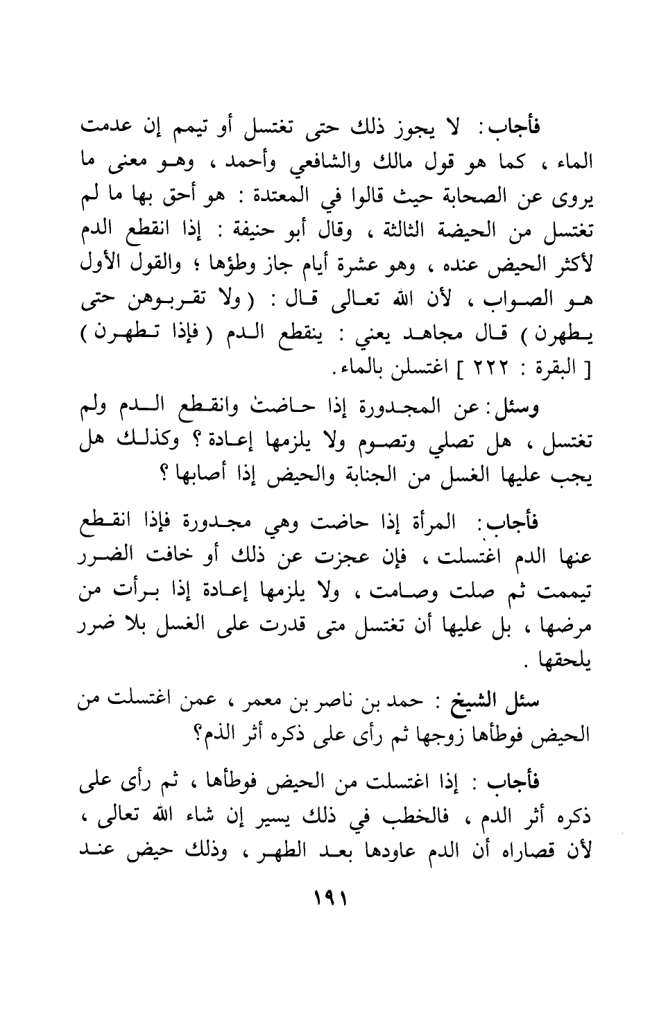 فأجاب: لا يجوز ذلك حتى تغتسل أو تتيمم إن عدمت الماء، كما هو قول مالك والشافعي وأحمد؛ وهو معنى ما يروى عن الصحابة حيث قالوا في المعتدة: هو أحق بها ما لم تغتسل من الحيضة الثالثة. وقال أبو حنيفة: إذا انقطع الدم لأكثر الحيض عنده، وهو عشرة أيام، جاز وطؤها؛ والقول الأول هو الصواب، لأن الله تعالى قال: {وَلا تَقْرَبُوهُنَّ حَتَّى يَطْهُرْنَ} [سورة البقرة آية: 222] ، قال مجاهد يعني: ينقطع الدم؛ {فَإِذَا تَطَهَّرْنَ} [سورة البقرة آية: 222] اغتسلن بالماء.