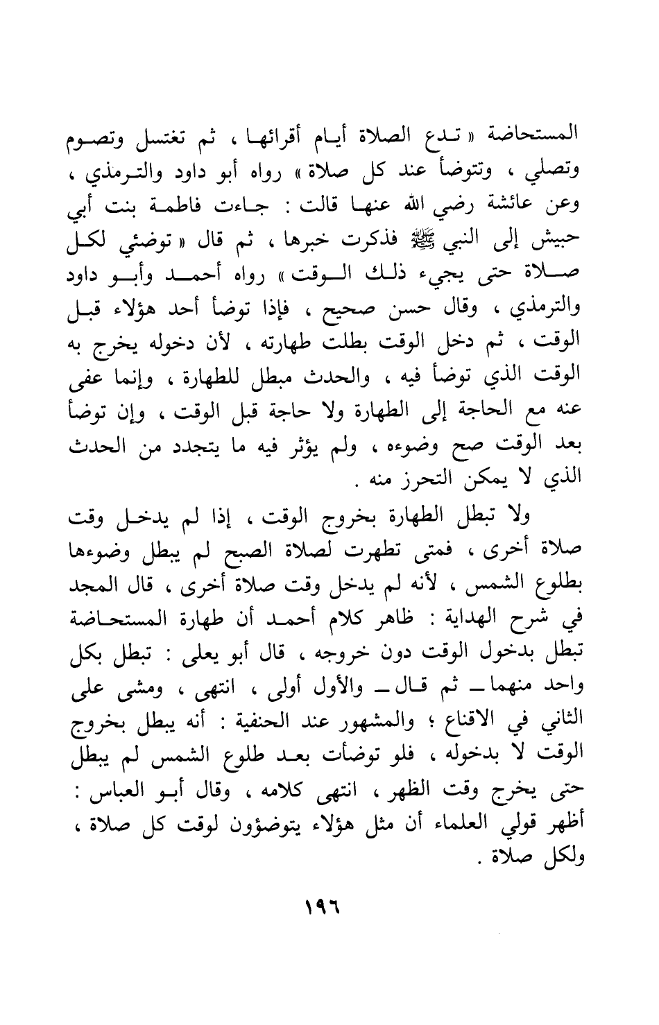 ولا تبطل الطهارة بخروج الوقت، إذا لم يدخل وقت صلاة أخرى؛ فمتى تطهرت لصلاة الصبح لم يبطل وضوؤها بطلوع الشمس، لأنه لم يدخل وقت صلاة أخرى؛ قال المجد في شرح الهداية: ظاهر كلام أحمد أن طهارة المستحاضة تبطل بدخول الوقت دون خروجه، قال أبو يعلى: تبطل بكل واحد منهما - ثم قال - والأول أولى. انتهى. ومشى على الثاني في الإقناع. والمشهور عند الحنفية: أنه يبطل بخروج الوقت لا بدخوله، فلو توضأت بعد طلوع الشمس لم يبطل حتى يخرج وقت الظهر. انتهى كلامه. وقال أبو العباس: أظهر قولي العلماء أن مثل هؤلاء يتوضؤون لوقت كل صلاة، ولكل صلاة.