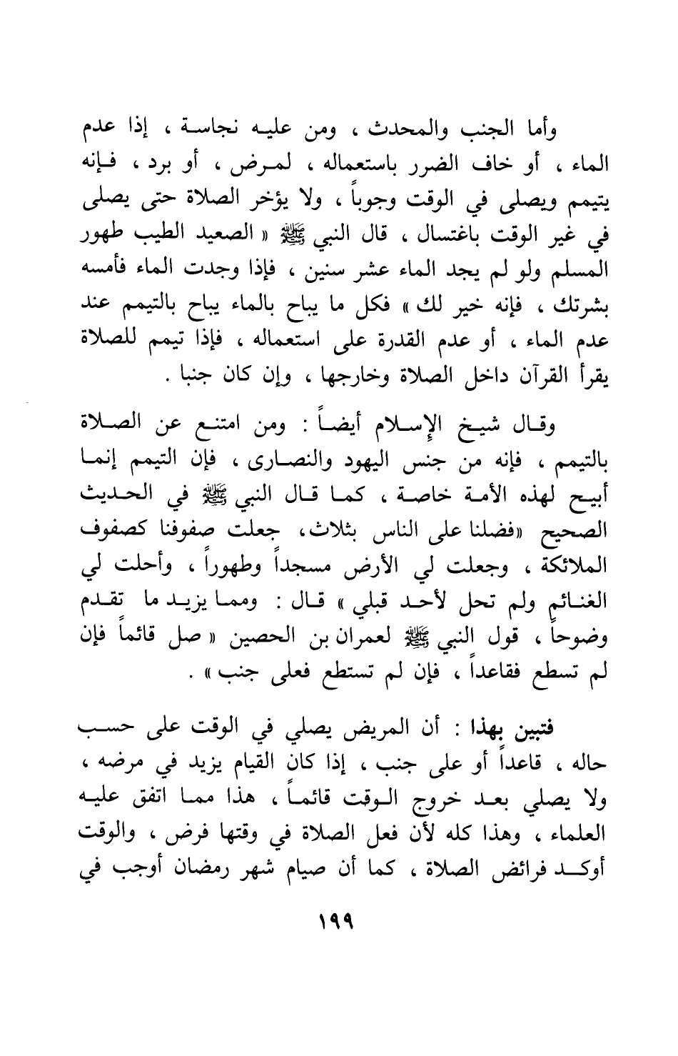 وقال شيخ الإسلام أيضاً: ومن امتنع عن الصلاة بالتيمم فإنه من جنس اليهود والنصارى؛ فإن التيمم إنما أبيح لهذه الأمة خاصة، كما قال النبي صلى الله عليه وسلم في الحديث الصحيح: " فضلنا على الناس بثلاث: جعلت صفوفنا كصفوف الملائكة، وجعلت لي الأرض مسجداً وطهوراً، وأحلت لي الغنائم ولم تحل لأحد قبلي " 2. قال: ومما يزيد ما تقدم وضوحاً، قول النبي صلى الله عليه وسلم لعمران بن الحصين: " صل قائماً، فإن لم تسطع فقاعداً، فإن لم تستطع فعلى جنب " 3.