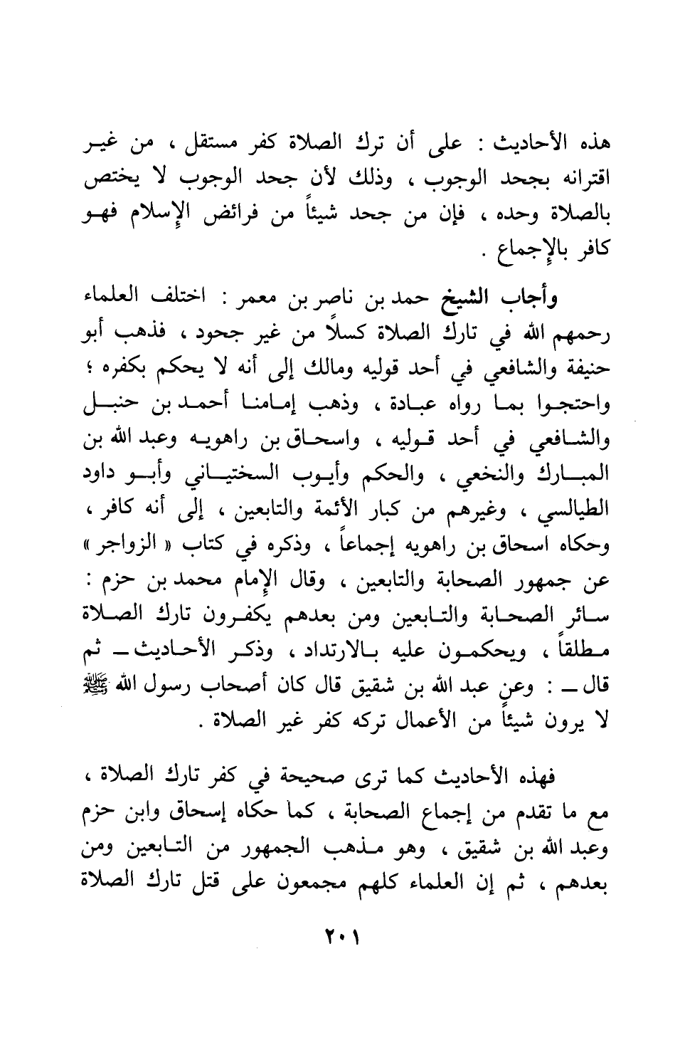 وأجاب الشيخ حمد بن ناصر بن معمر: اختلف العلماء، رحمهم الله، في تارك الصلاة كسلاً من غير جحود: فذهب أبو حنيفة والشافعي في أحد قوليه، ومالك، إلى أنه لا يحكم بكفره; واحتجوا بما رواه عبادة. وذهب إمامنا أحمد بن حنبل والشافعي في أحد قوليه، وإسحاق بن راهويه وعبد الله بن المبارك والنخعي، والحكم وأيوب السختياني وأبو داود الطيالسي، وغيرهم من كبار الأئمة والتابعين، إلى أنه كافر، وحكاه إسحاق بن راهويه إجماعاً، وذكره في كتاب الزواجر عن جمهور الصحابة والتابعين. وقال الإمام محمد بن حزم: سائر الصحابة والتابعين ومن بعدهم يكفِّرون تارك الصلاة مطلقاً، ويحكمون عليه بالارتداد، وذكر الأحاديث - ثم قال - وعن عبد الله بن شقيق قال: كان أصحاب رسول الله صلى الله عليه وسلم لا يرون شيئاً من الأعمال ترْكه كفر غير الصلاة.