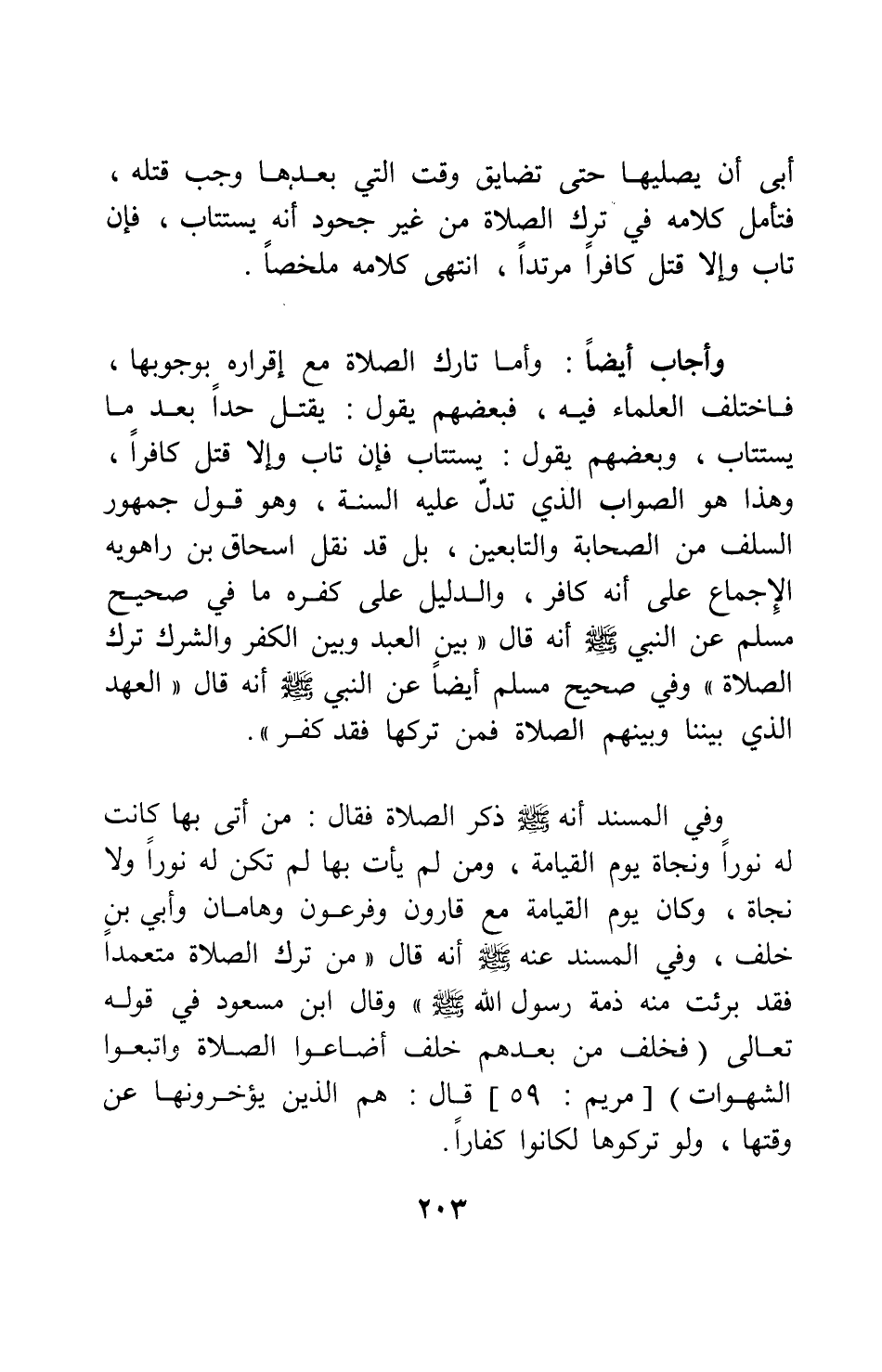 وفي المسند أنه صلى الله عليه وسلم ذكر الصلاة فقال: " من أتى بها كانت له نوراً ونجاة يوم القيامة، ومن لم يأت بها لم تكن له نوراً ولا نجاة، وكان يوم القيامة مع قارون وفرعون وهامان وأبي بن خلف " 3، وفي المسند عنه صلى الله عليه وسلم أنه قال: " من ترك الصلاة متعمداً فقد برئت منه ذمة رسول الله صلى الله عليه وسلم " 4. وقال ابن مسعود في قوله تعالى: {فَخَلَفَ مِنْ بَعْدِهِمْ خَلْفٌ أَضَاعُوا الصَّلاةَ وَاتَّبَعُوا الشَّهَوَاتِ} [سورة مريم آية: 59] ، قال: هم الذين يؤخرونها عن وقتها، ولو تركوها لكانوا كفاراً.