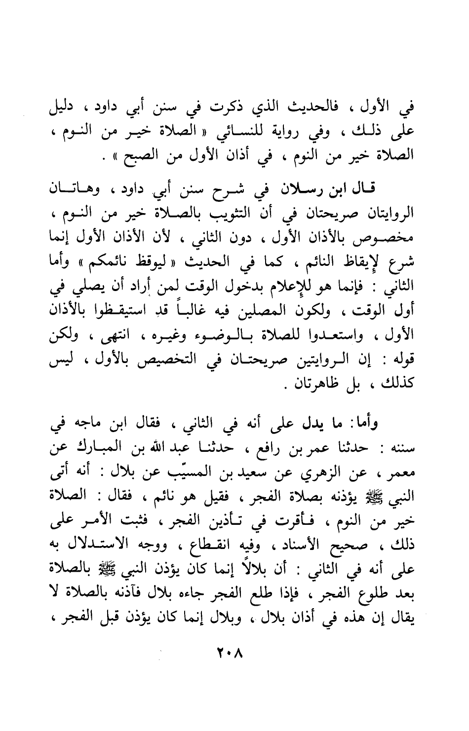 وأما ما يدل على أنه في الثاني، فقال ابن ماجة في سننه: حدثنا عمر بن رافع، حدثنا عبد الله بن المبارك عن معمر، عن الزهري عن سعيد بن المسيب عن بلال: " أنه أتى النبي صلى الله عليه وسلم يؤذنه بصلاة الفجر، فقيل هو نائم، فقال: الصلاة خير من النوم، فأقرت في تأذين الفجر، فثبت الأمر على ذلك " 3، صحيح الإسناد، وفيه انقطاع؛ ووجه الاستدلال به على أنه في الثاني: أن بلالاً إنما كان يؤذن النبي صلى الله عليه وسلم بالصلاة بعد طلوع الفجر، فإذا طلع الفجر جاءه بلال فآذنه بالصلاة، لا يقال إن هذه في أذان بلال، وبلال إنما كان يؤذن قبل الفجر،