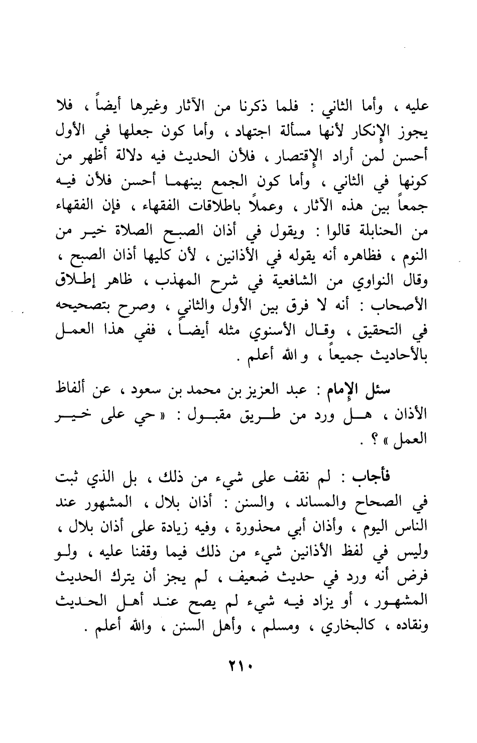 فأجاب: لم نقف على شيء من ذلك، بل الذي ثبت في الصحاح والمساند والسنن: أذان بلال، المشهور عند الناس اليوم، وأذان أبي محذورة، وفيه زيادة على أذان بلال، وليس في لفظ الأذانين شيء من ذلك فيما وقفنا عليه. ولو فرض أنه ورد في حديث ضعيف، لم يجز أن يترك الحديث المشهور، أو يزاد فيه شيء لم يصح عند أهل الحديث ونقاده، كالبخاري، ومسلم، وأهل السنن، والله أعلم.